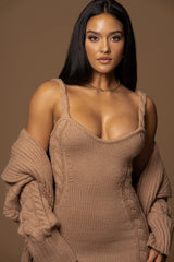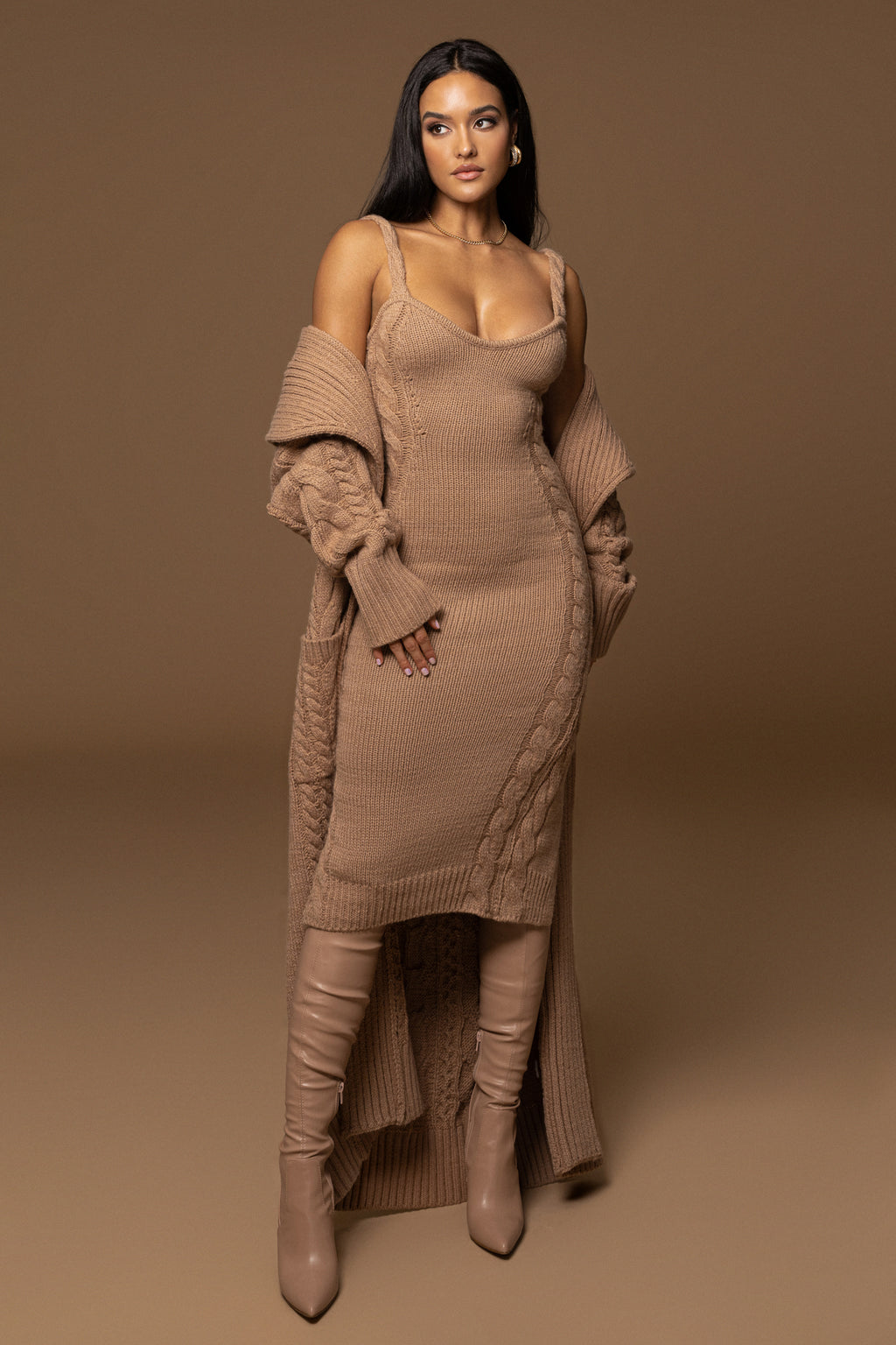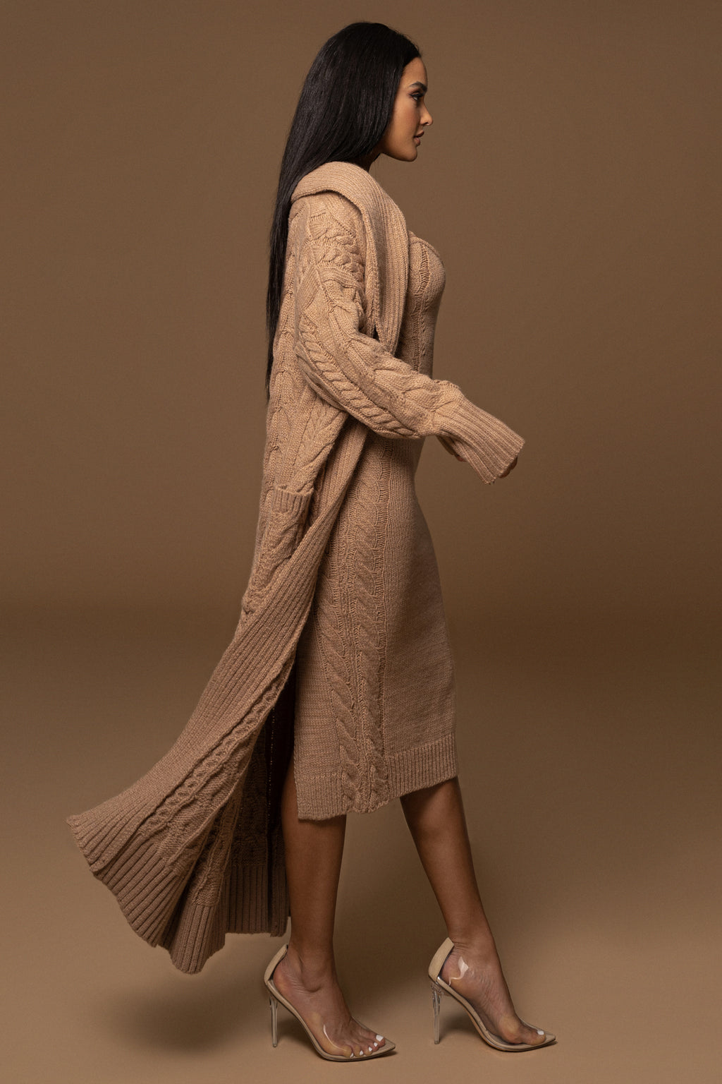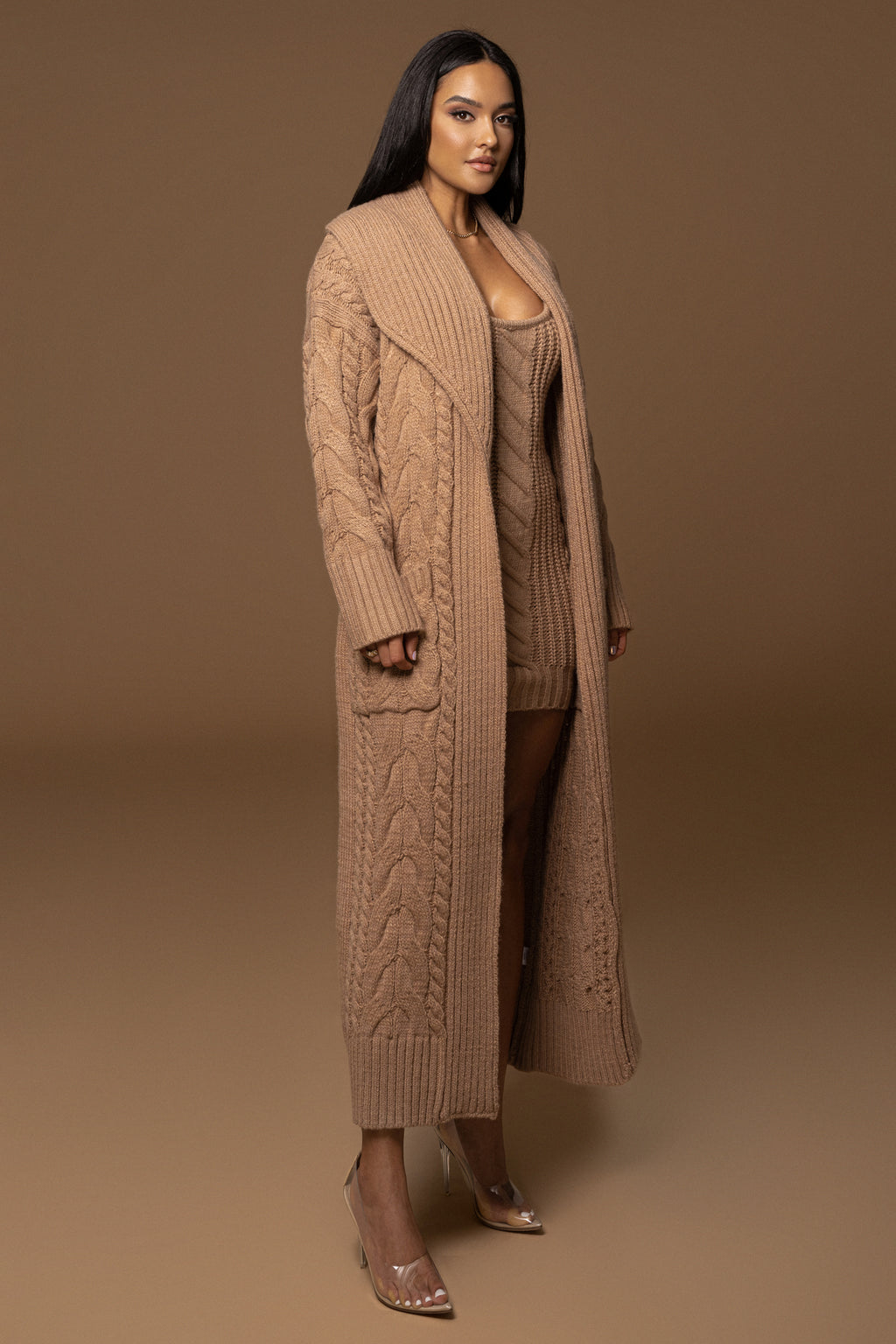 Add the loveliest top layer to your wardrobe with our Beige Upstate Cable Knit Cardigan. Crafted in a cable-knit fabric, this longline cardigan features a beautiful shawl collar with long sleeves and two functional welt pockets. Pair with our Evonna Sweater Knit Dress for the full look. Open-front. Stretchy.