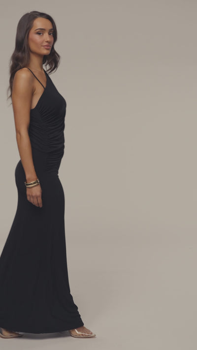 Embrace sculptural elegance with our Black Astra Cutout Maxi Dress. This one-shoulder design features an asymmetric neckline and soft draping that flows seamlessly across the bodice and back, creating a fluid, draped look. A side cutout at the waist adds a modern touch, while the floor-length skirt enhances its graceful silhouette. Crafted from a smooth, stretch-knit fabric for comfort and movement, this piece embodies understated sophistication. Single lined. Stretchy.