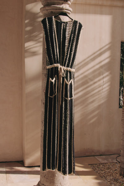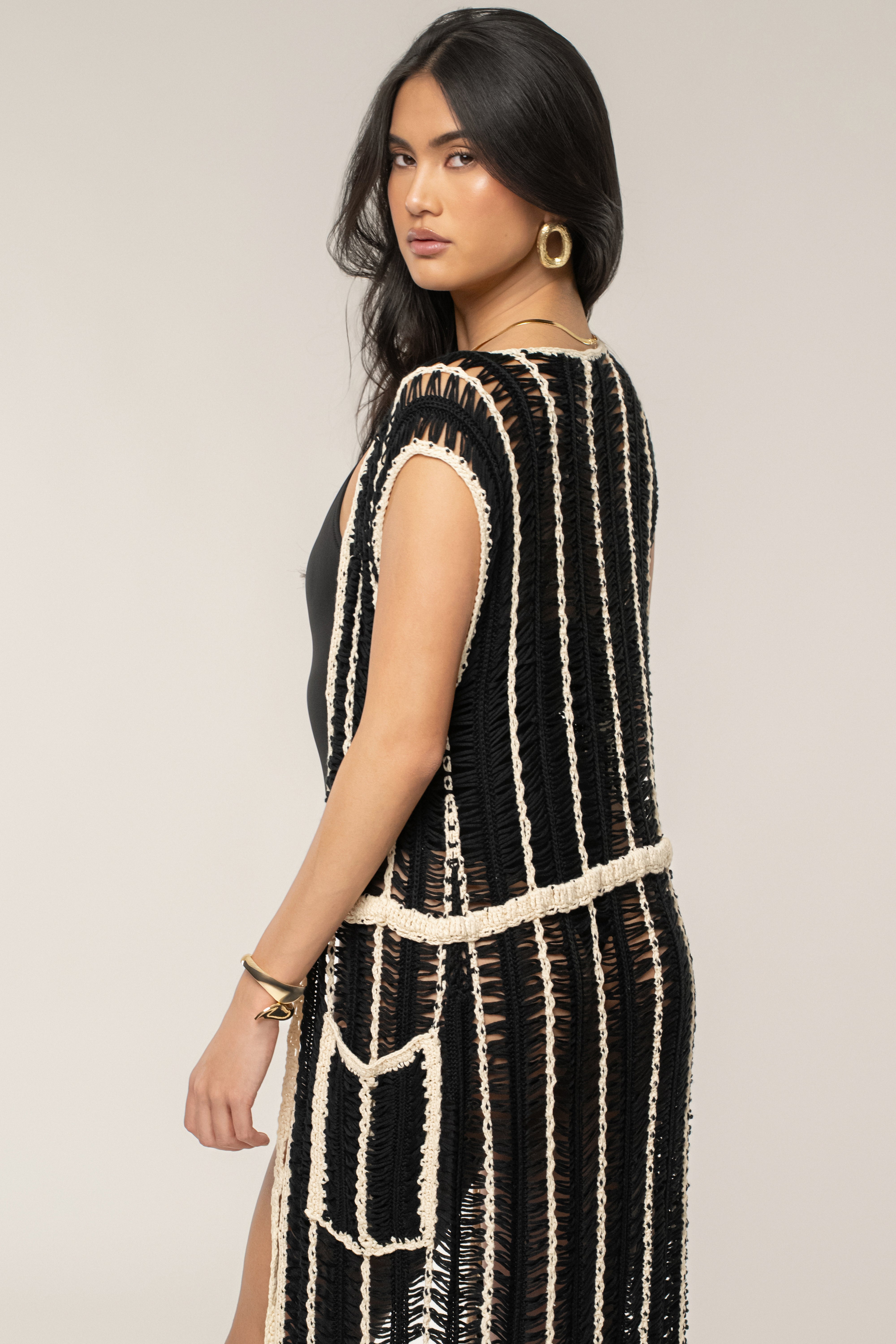 Immerse yourself in coastal textures with our Black/Beige Marcelle Crochet Maxi Dress. This open-front cardigan features a striped crochet inspired design made from lightweight knit fabric. A drawstring belt tied at the waist flatters your silhouette, while the two front pockets add both functionality and charm. Whether styled over casual dresses or paired with your favorite summer outfits. Stretchy.