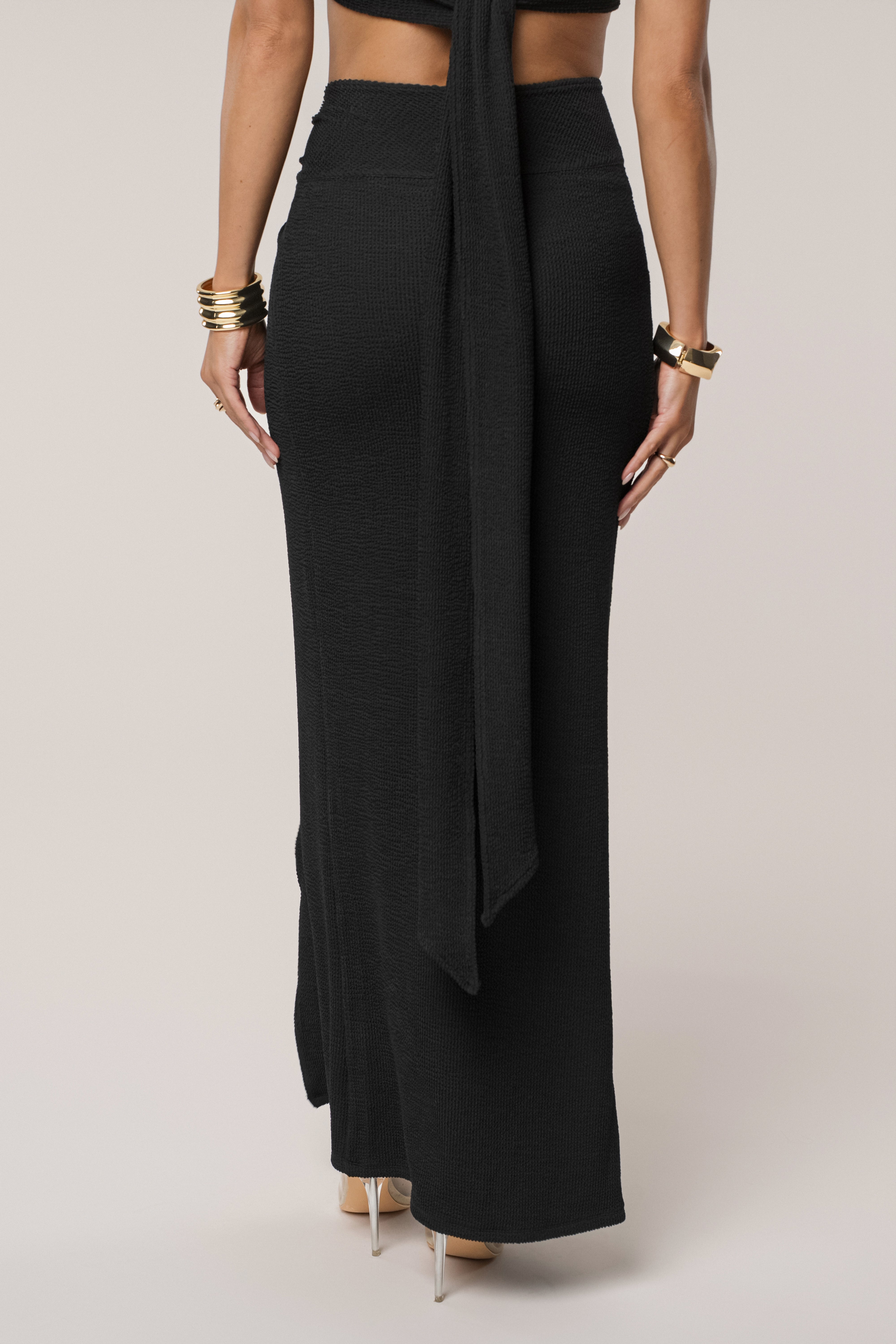 Escape to paradise in style with our Black Deidra Draped Skirt Set. The set features a chic bralette top with adjustable/removable shoulder straps and back ties offering both comfort and style. Paired perfectly with a high-waisted wrap skirt, it showcases a dramatic slit on the right side, blending sophistication with a touch of allure. Crafted from a stretchy smocked fabric, this two piece skirt set is as versatile as it is stylish. Sold as set.