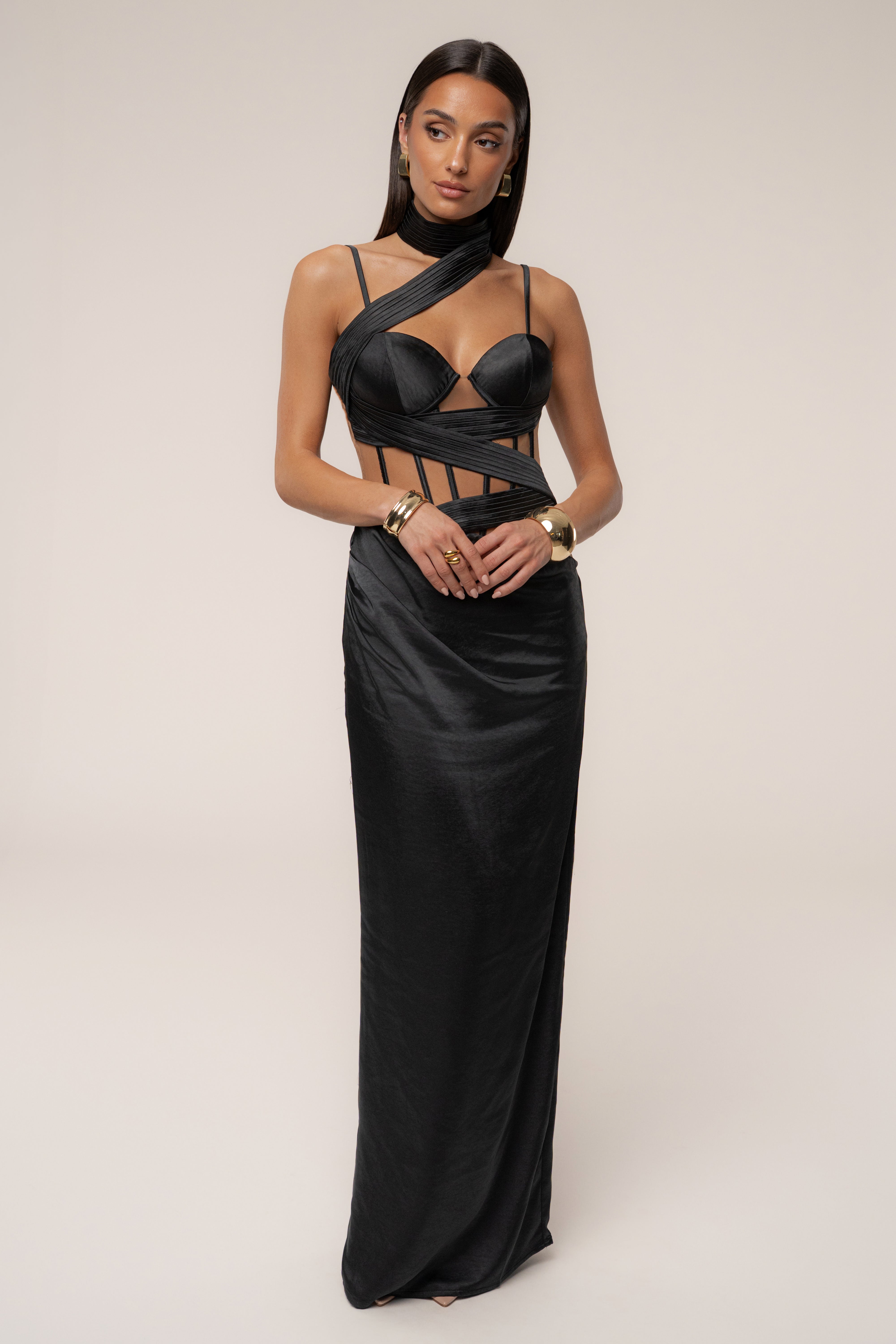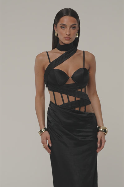 All eyes on you in our Black Golden Hour Corset Maxi Dress. Featuring a sweetheart neckline with adjustable/removable straps and a pleated crossover strap that wrap around the chest and neck. The form-fitting silhouette is complemented by an illusion mesh bodice, waist ruching, and structured boning for a sculpted finish. A non-slip silicone grip at the bust ensures a secure fit. Complete with a neck button closure, hidden back zipper, and a back slit hem. Bra padding. Double lined. No stretch.