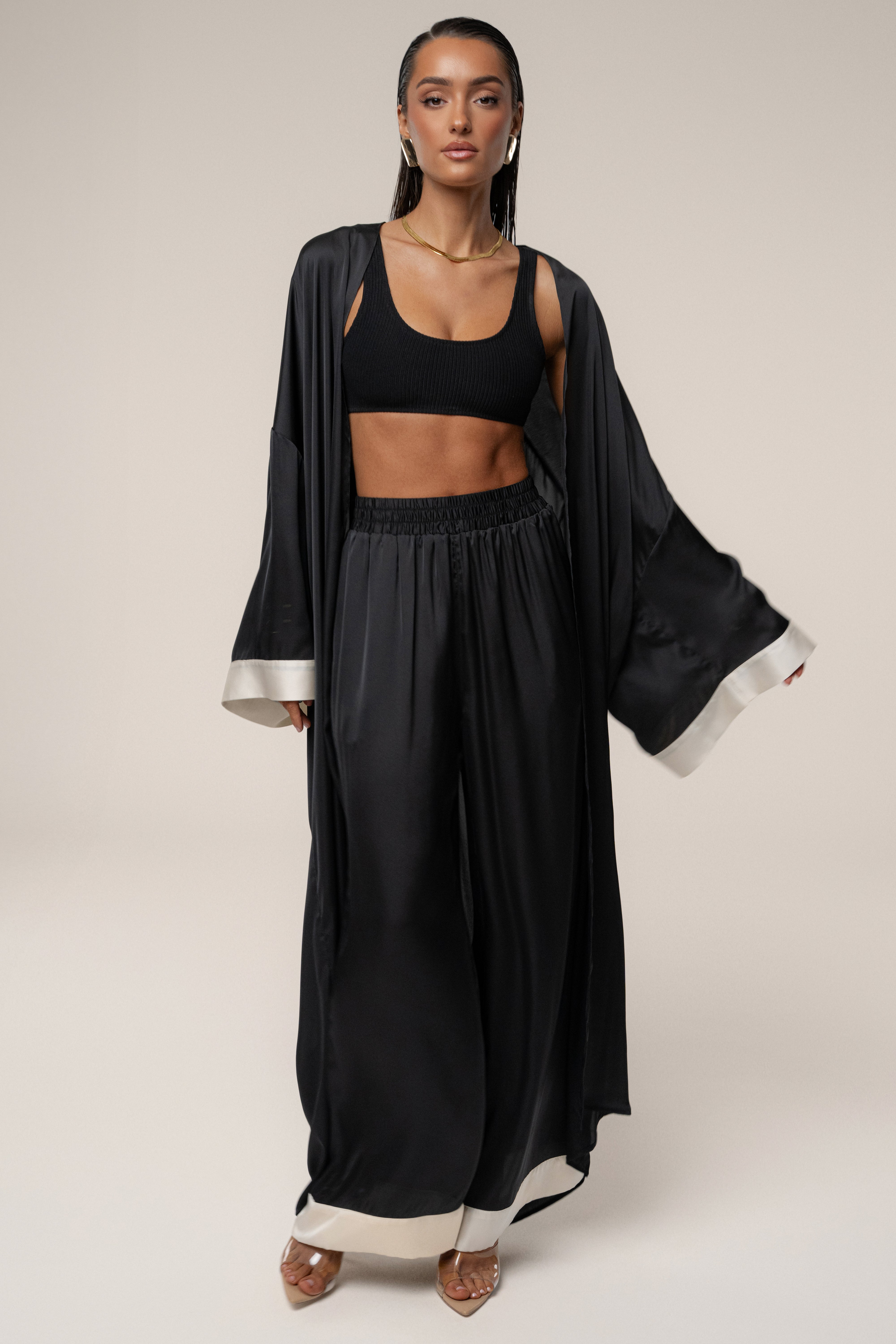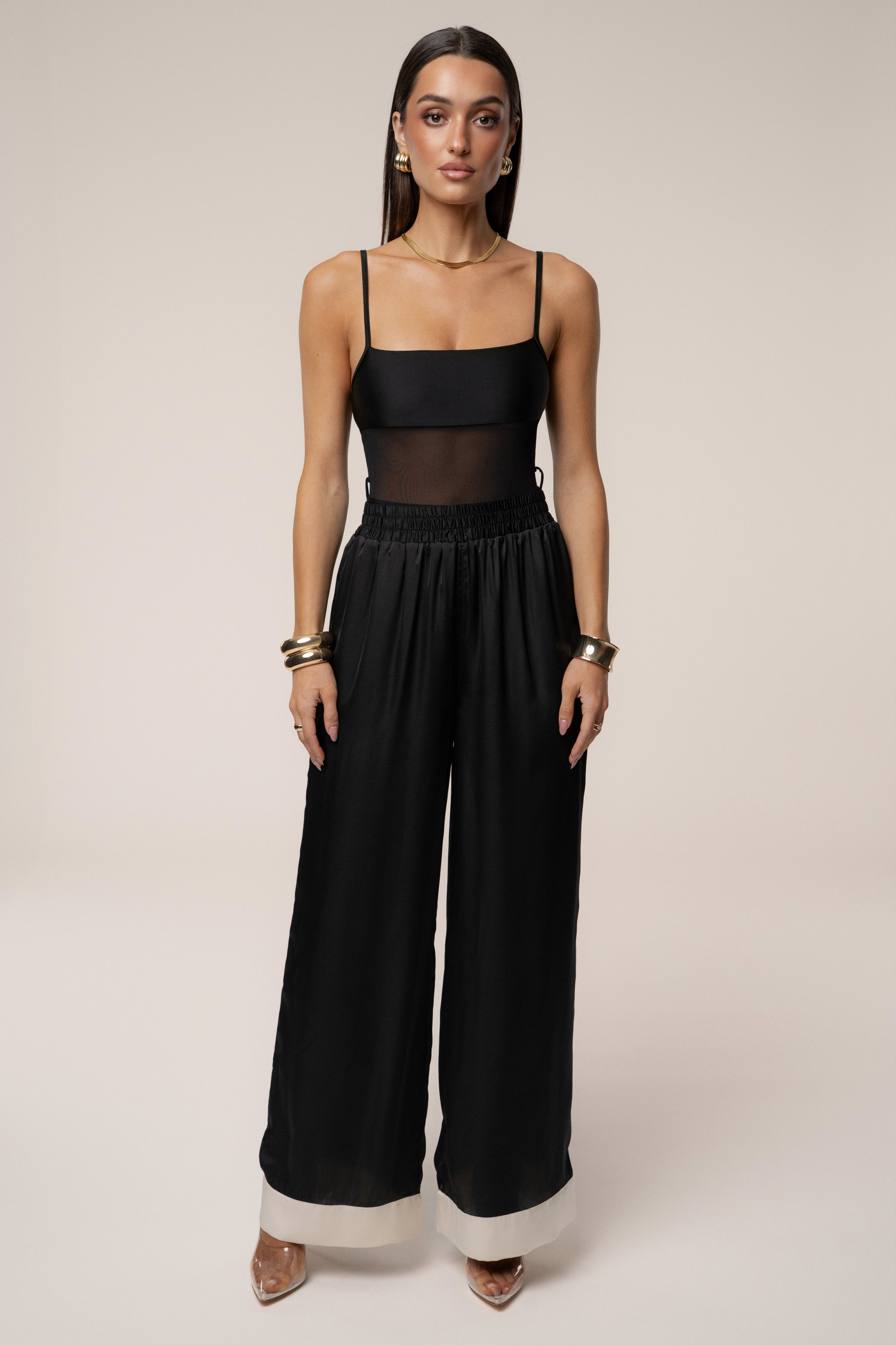 Step into effortless style with the Black Jet Set Wide Leg Pants. These high-waisted pants feature a flowy wide-leg design in a satin-like fabric that exudes elegant charm. With functional side pockets and a comfortable elastic waistband, they combine practicality with sophistication. Perfect for any type of occasion, these pants offer the ultimate blend of comfort and bold fashion. Single lined. Stretchy. Not sold as set.