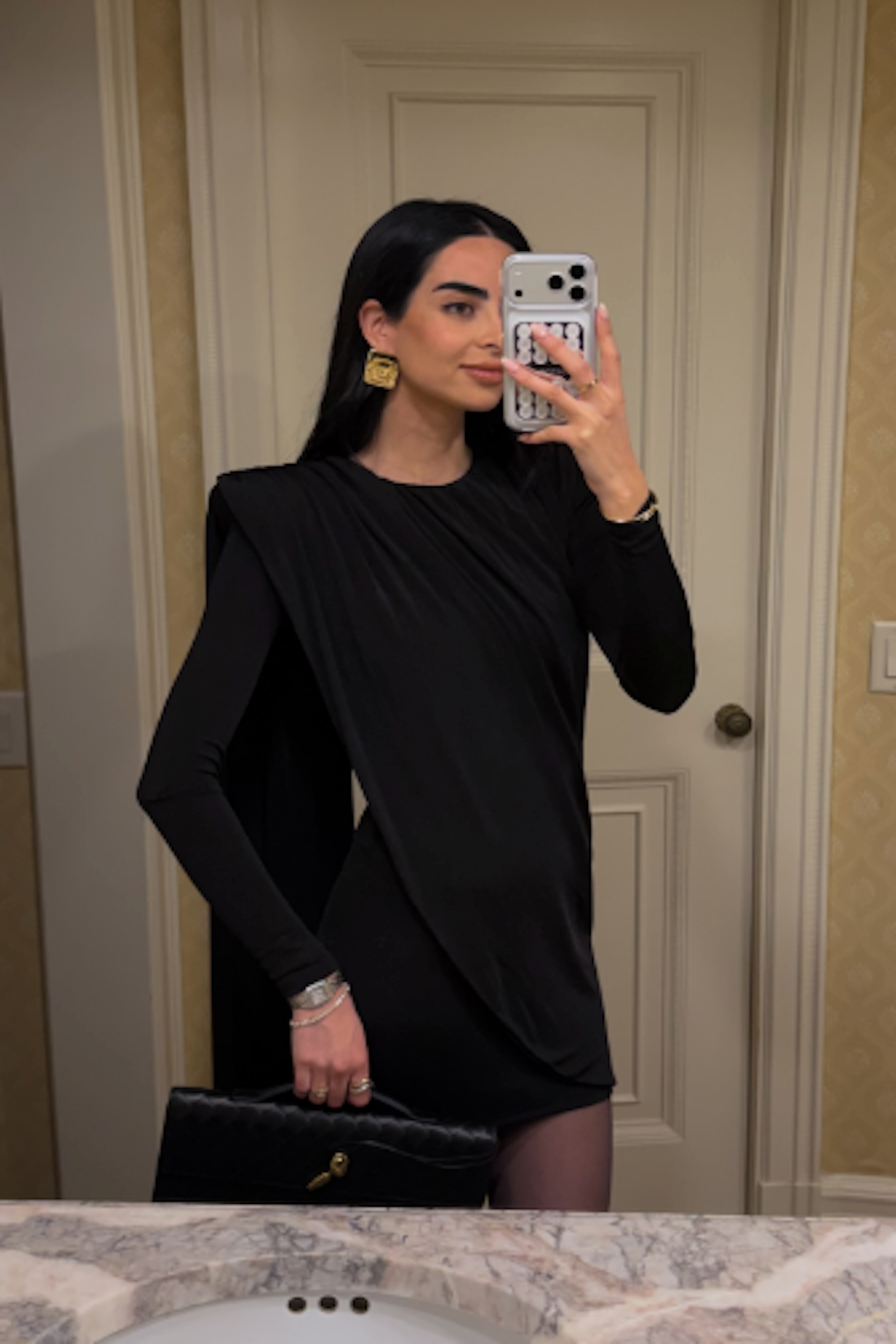 Our Black Midnight Draped Mini Dress brings bold sophistication for any evening occasion. This long-sleeved mini dress features a striking asymmetrical design with a dramatic draped fabric detail cascading from the shoulder, adding a touch of elegance and movement. A ruched neckline and padded shoulders create a flattering and structured look. Perfect for cocktail parties or upscale events. Back zipper closure. Stretchy. Double-lined.