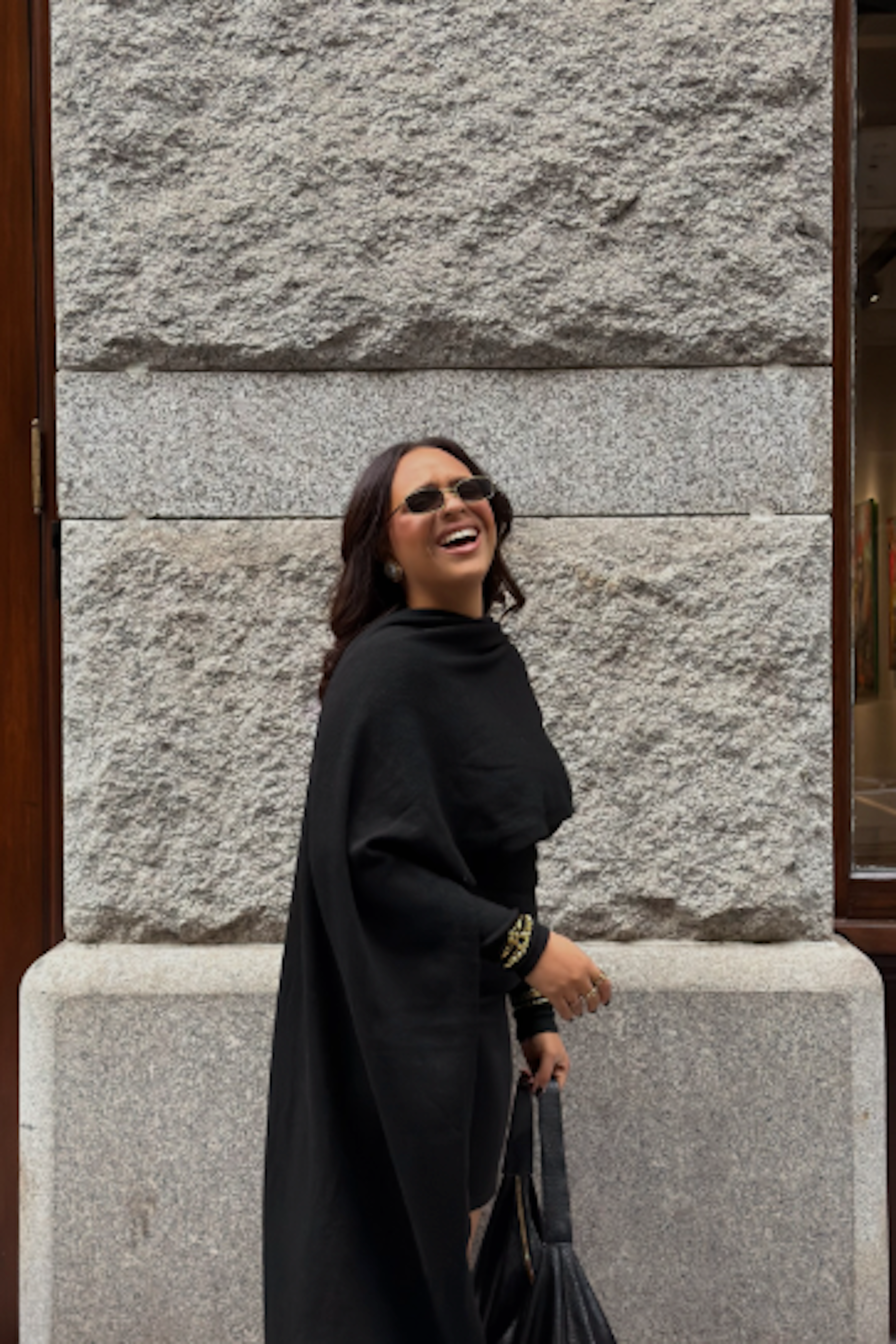 Our new Black Scarf Draped Mini Dress is a unique fusion of elegance and versatility. This long sleeve mini dress showcases a mock neck with a detachable scarf inspired cape that effortlessly drapes around your neck, offering a versatile and dynamic silhouette. Crafted from a soft knit material offering both comfort and style for the season. Stretchy. Single lined.