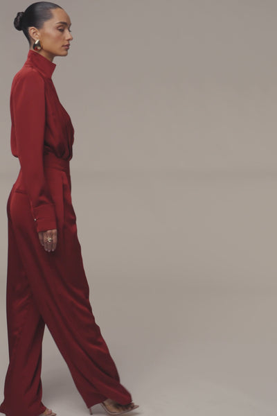 Our Burgundy Visionary Pleated Bodysuit is a refined statement piece designed for your everyday wardrobe. Featuring soft pleating throughout, this long-sleeve bodysuit creates a draped effect that flatters the neckline and contours the body. Subtle shoulder structure and a deep plunge cut add dimension and polish, while the smooth double-lined base ensures a comfortable, secure fit. Finished with a thong bottom and snap closure. Designed to transition effortlessly from desk to dinner. Pair with our Clara Wide Leg Pleated Trousers for the full look. Minimal Stretch. Double-lined. Not sold as set.