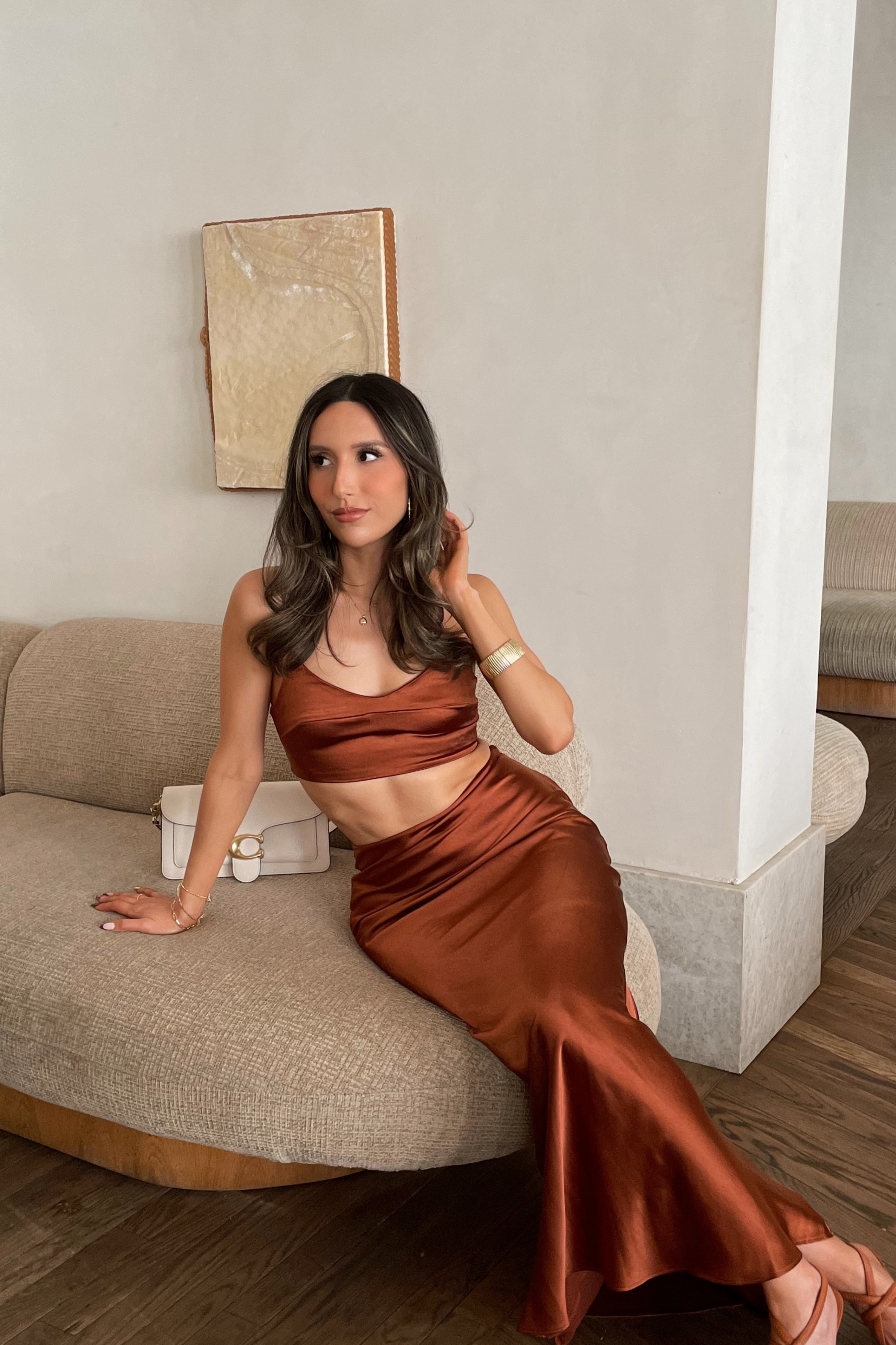 Our two-piece Copper Isella 2-Piece Skirt Set is made with high-quality materials for lasting and luxurious wear. The top is crafted in a double lined fabric with bungee shoulder straps and a back gold-tone zipper. The matching skirt comes with a high waist, hidden side zipper, and a maxi mermaid inspired hem, perfect for your most special occasions. Sold as set. No Stretch.