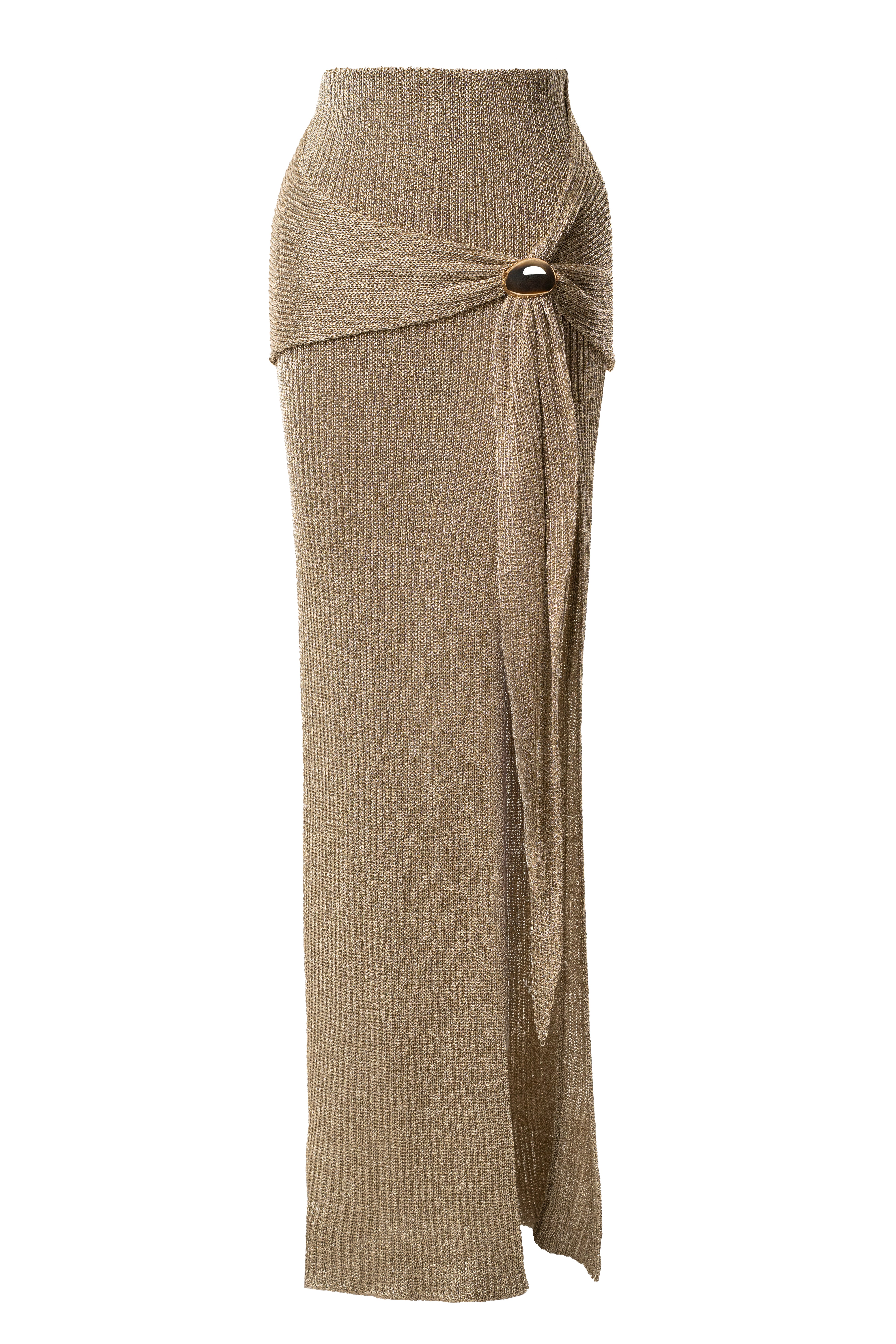 Radiate elegance in our Gold Hazel Metallic Wrap Skirt, designed to blend modern sophistication with shimmering detail. Crafted from metallic sheer-knit fabric, this skirt features a wrap style design with a side slit. A statement knot accented in gold heightens this piece with a touch of elegance. Finished with an elastic waistband for a comfortable, flexible fit. Pair with our Luminous Metallic Bodysuit for the full look. Stretchy. Not sold as set.