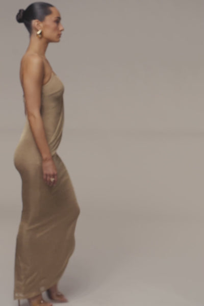 Our Gold Midnight Sky Maxi Dress is a breathtaking maxi-length gown that exudes elegance and sophistication. Crafted from a shimmering fabric, it features a sleek, form-fitting silhouette with delicate bungee spaghetti straps and a straight neckline. The asymmetrical draped detail across the bodice adds a touch of modern appeal, while the back slit ensures ease of movement. Perfect for formal events or glamorous evenings. Back zipper closure. Stretchy. Double-lined.