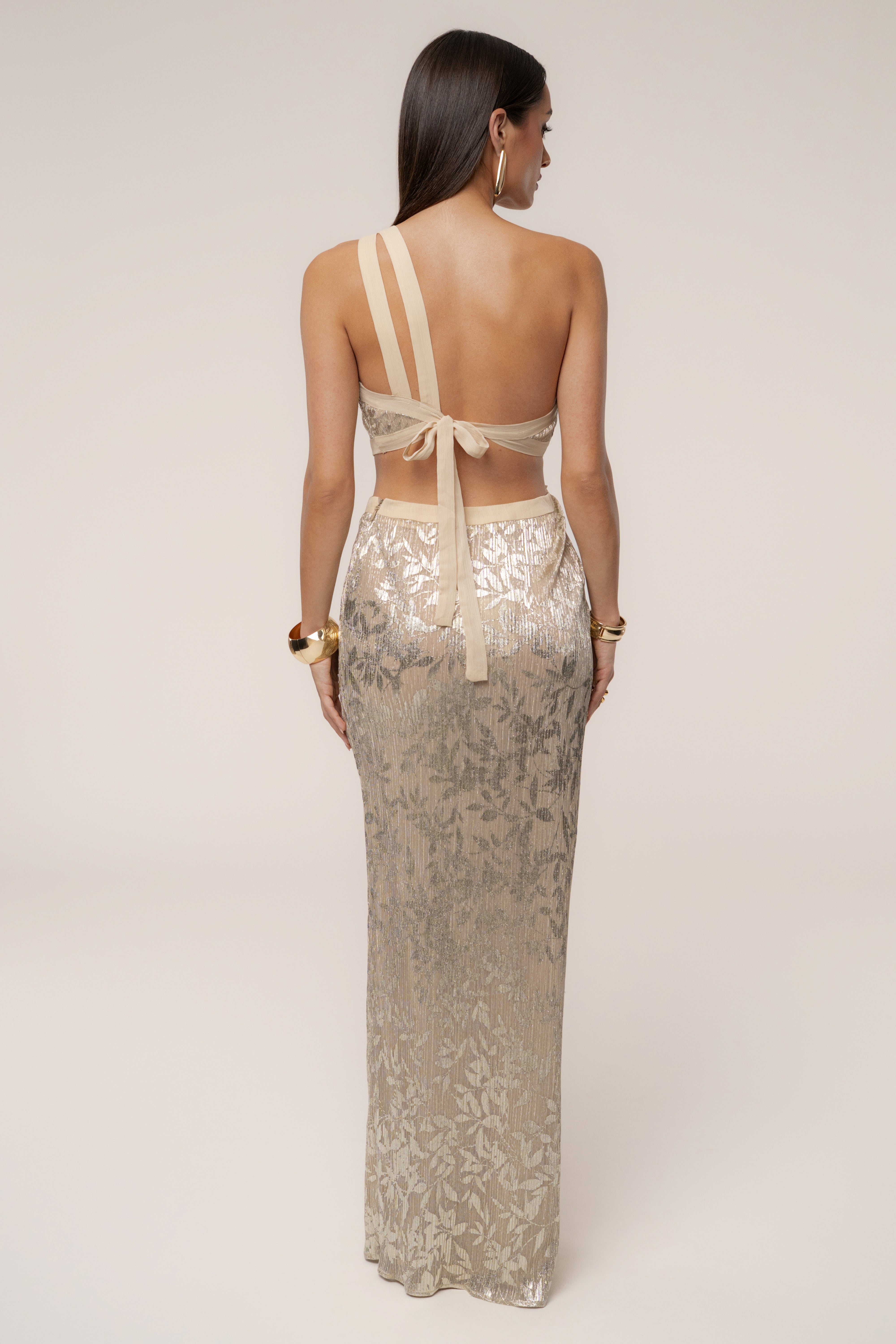 Glow with effortless elegance in our Gold One Shoulder Keyhole Dress. This maxi-length gown features a one-shoulder neckline with stylish cutouts and a back tie closure, all highlighted by a gold-tone center embellishment. Crafted from lightweight chiffon with a shimmering floral pattern, it delivers a luxurious, ethereal finish. Finished with a hidden side zipper. Double lined. Minimal stretch.