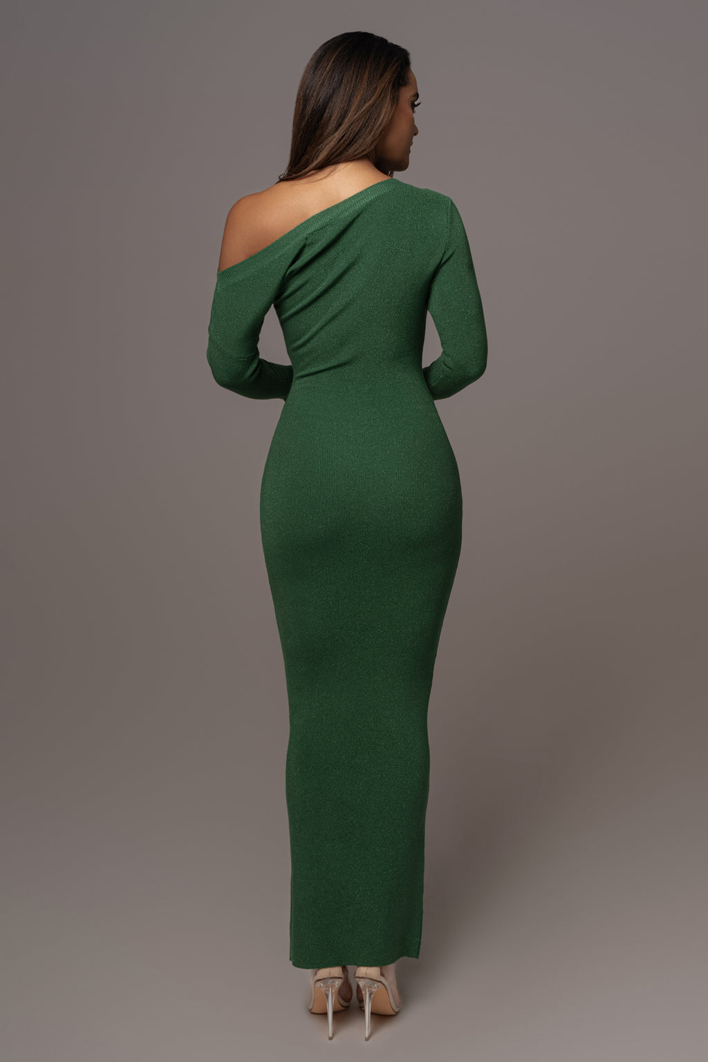 Step out and shine in our Green Night Shimmers Asymmetrical Maxi Dress. This dress exudes radiance with its shimmering design. Made from warm knit fabric, it features an asymmetric neckline, long sleeves, and a fitted silhouette for a sophisticated finish. Stretchy. Single lined.