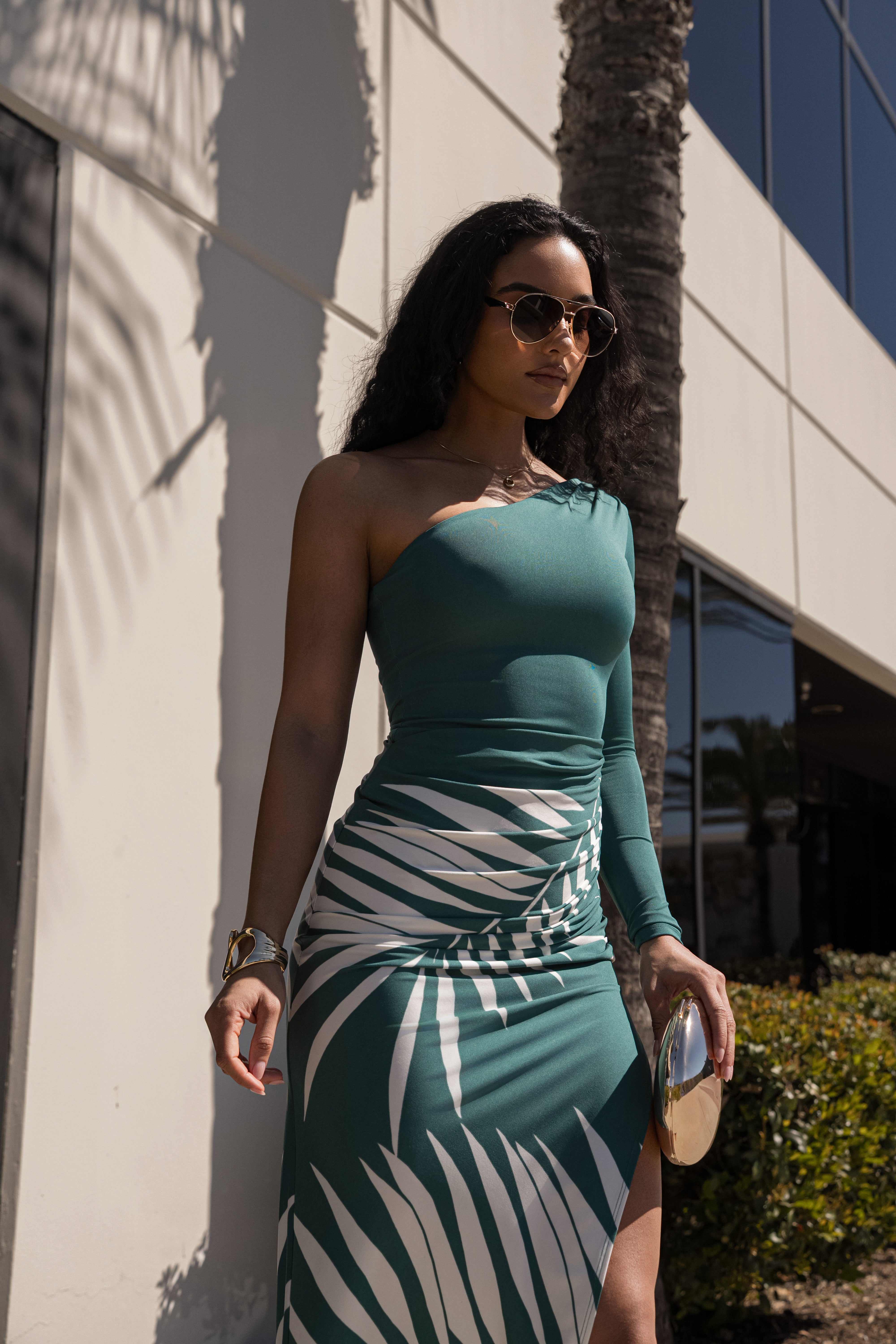 Island elegance, redefined with our new Green One Shoulder Palm Print Dress. Featuring a one shoulder neckline with a striking white leaf pattern, this midi dress embodies tropical elegance. It's fitted silhouette flatters your figure, while the asymmetrical skirt with a high slit adds a touch of edge and movement. Pair it with your next escape. Stretchy. Half-lined.