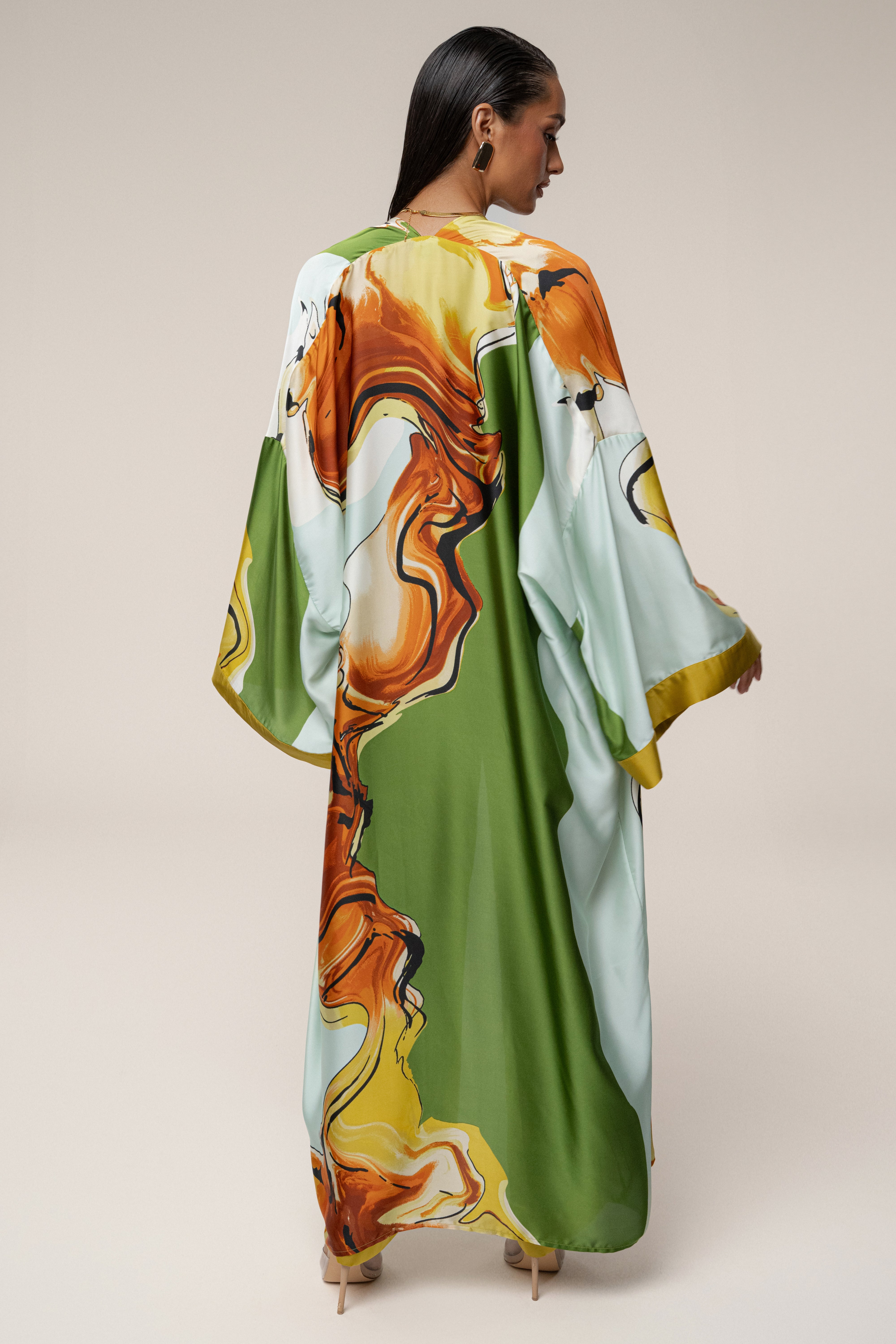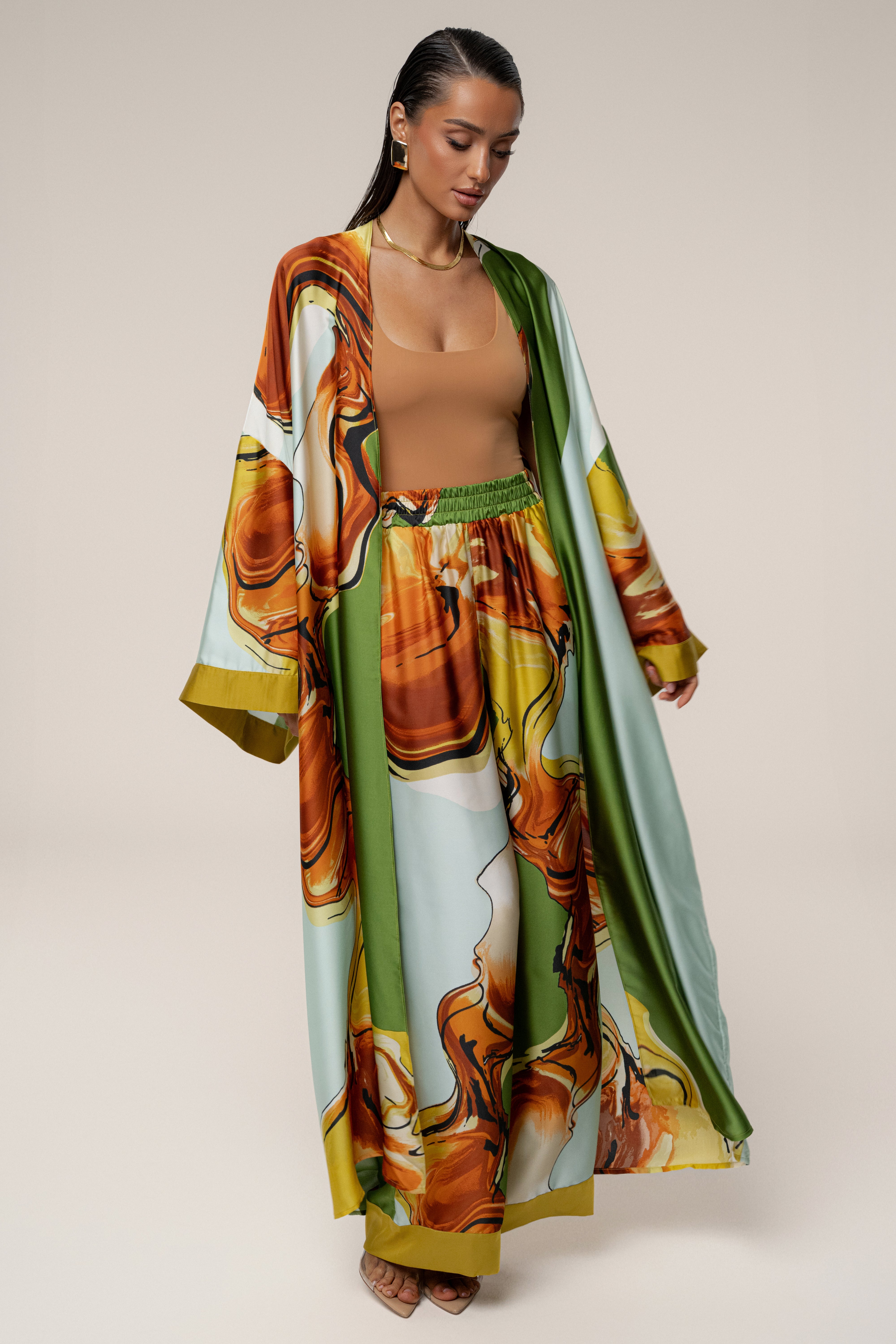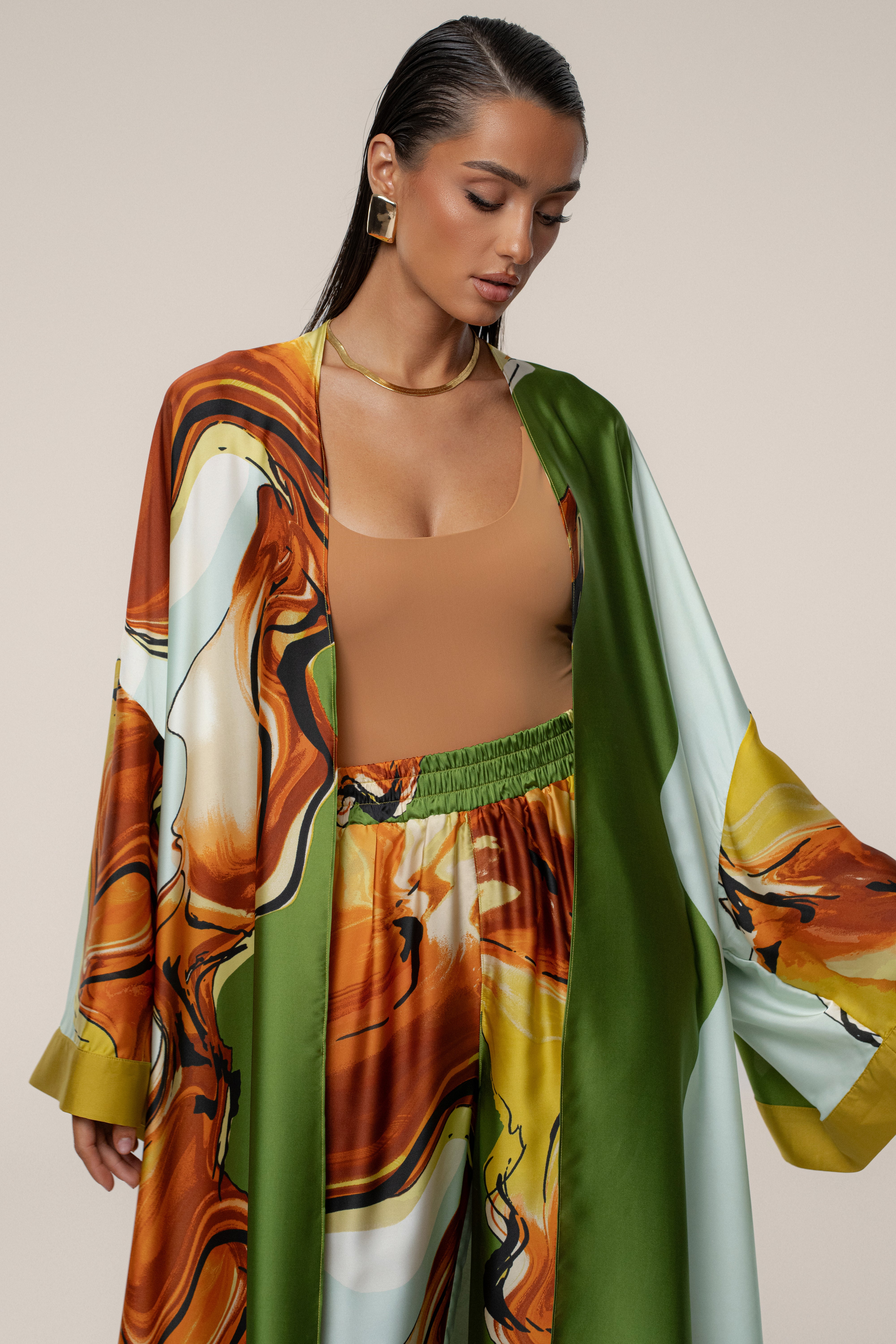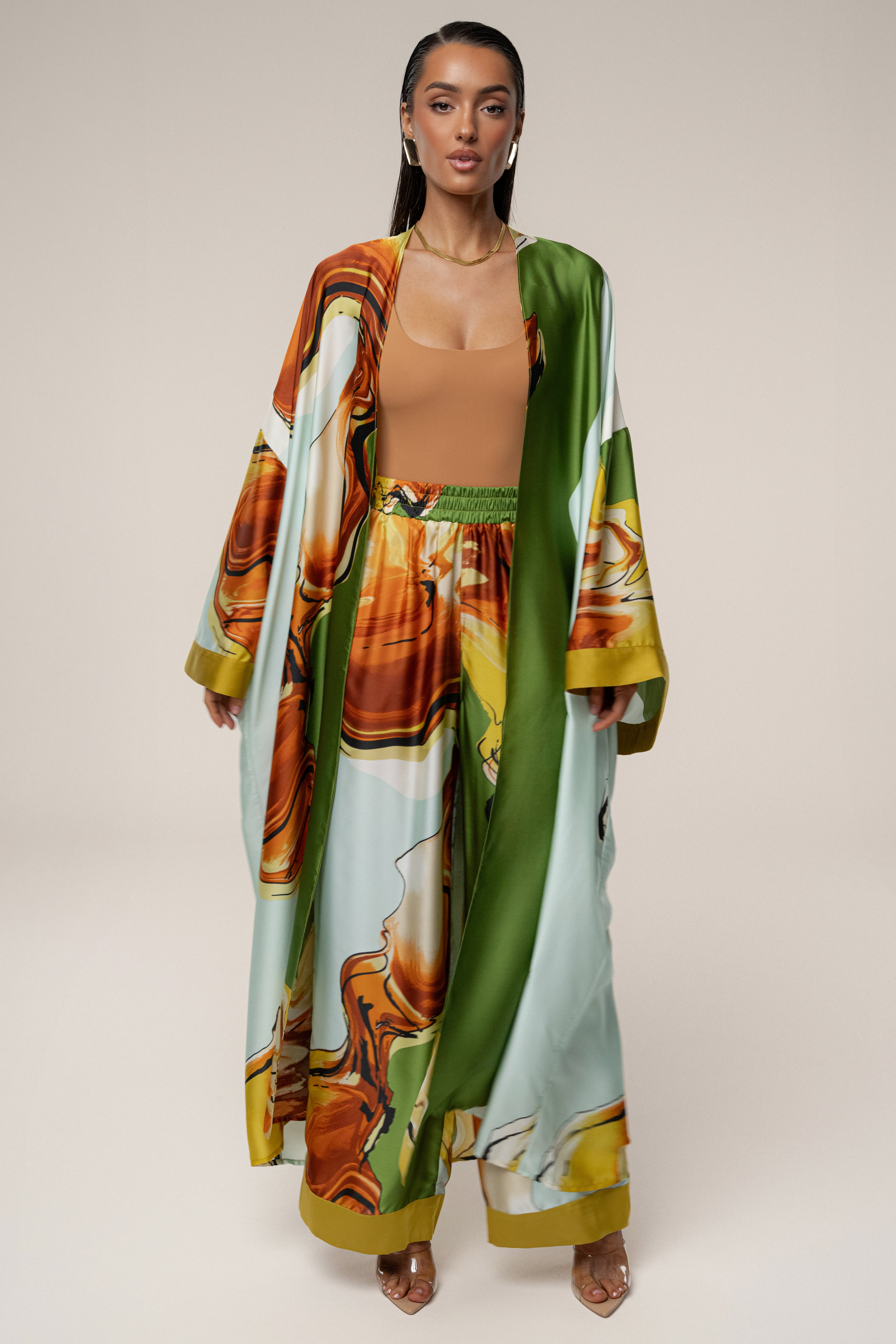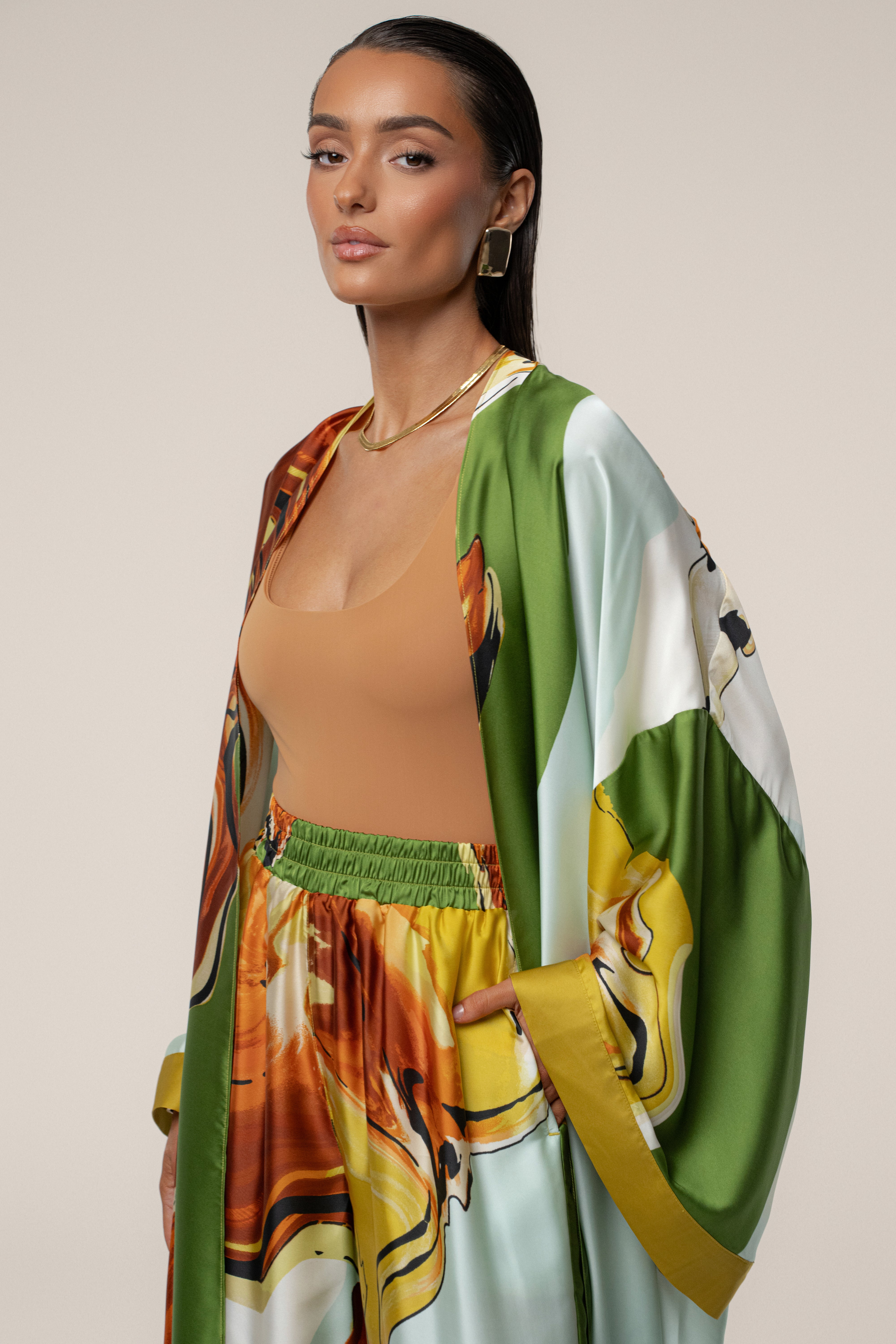 Wrap yourself in breezy sophistication with our Green Tropical Print Nola Maxi Duster, a vibrant statement piece that blends comfort and style. Featuring a multicolor swirl print in green, light blue, and shades of orange, this maxi-length duster stands out with its flowing, loose fit and elegant bell sleeves. Perfect for summer days or relaxed lounging, it offers effortless style with a dash of bold color. Single lined. No stretch. Not sold as set.