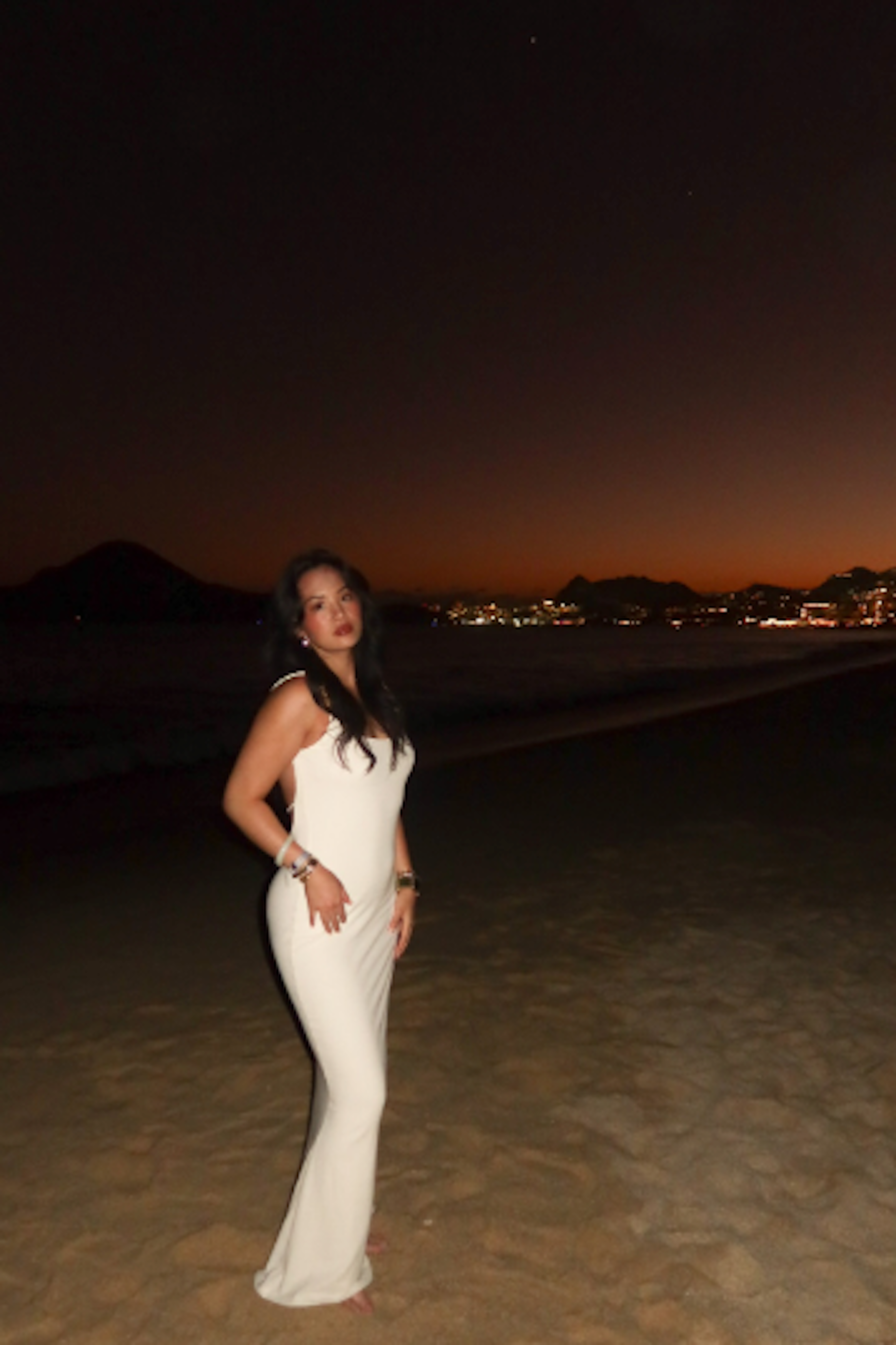 Sail away in style with our Ivory Nautical Escape Maxi Dress. This stunning maxi dress features a round neckline and twisted straps adorned with marble beads, giving it an elegant touch. Crafted from a lightweight fabric, this dress is perfect for a day at the beach or a night out on the town. Double lined. Stretchy.