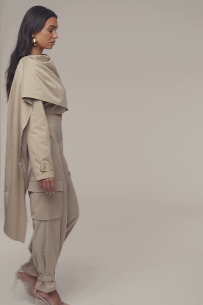 Redefine your outerwear game with our Khaki Next Level Cape Jacket, a fusion of functional design and utilitarian edge. This standout jacket features a boat neckline, long sleeves with detailed cuffs, and a dramatic asymmetrical drape that flows effortlessly across the body, offering a silhouette that is both architectural and fluid. Whether you are navigating the city streets or attending a gallery opening, this set transitions from day to night. Snap button closures. No stretch. Lined interior.