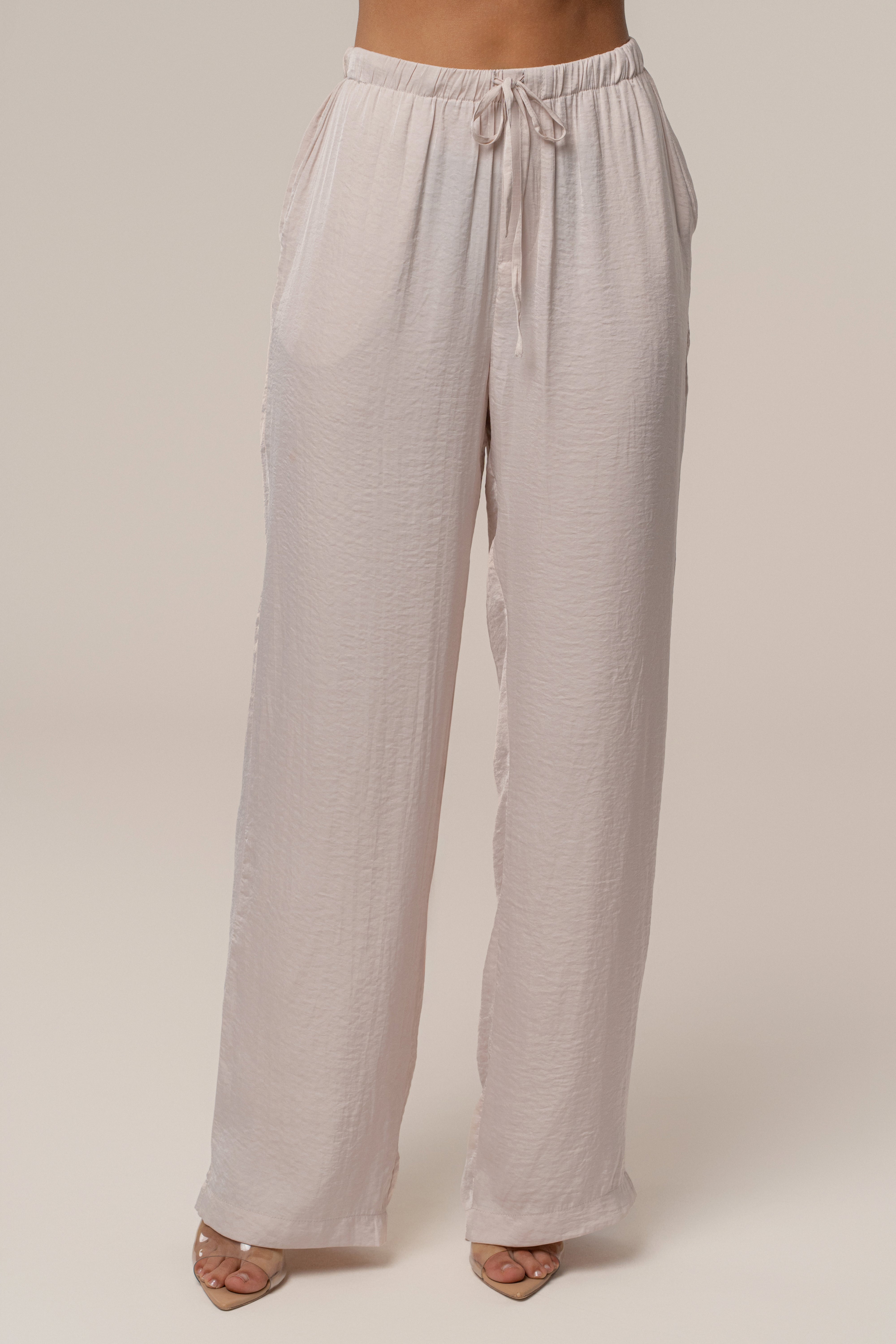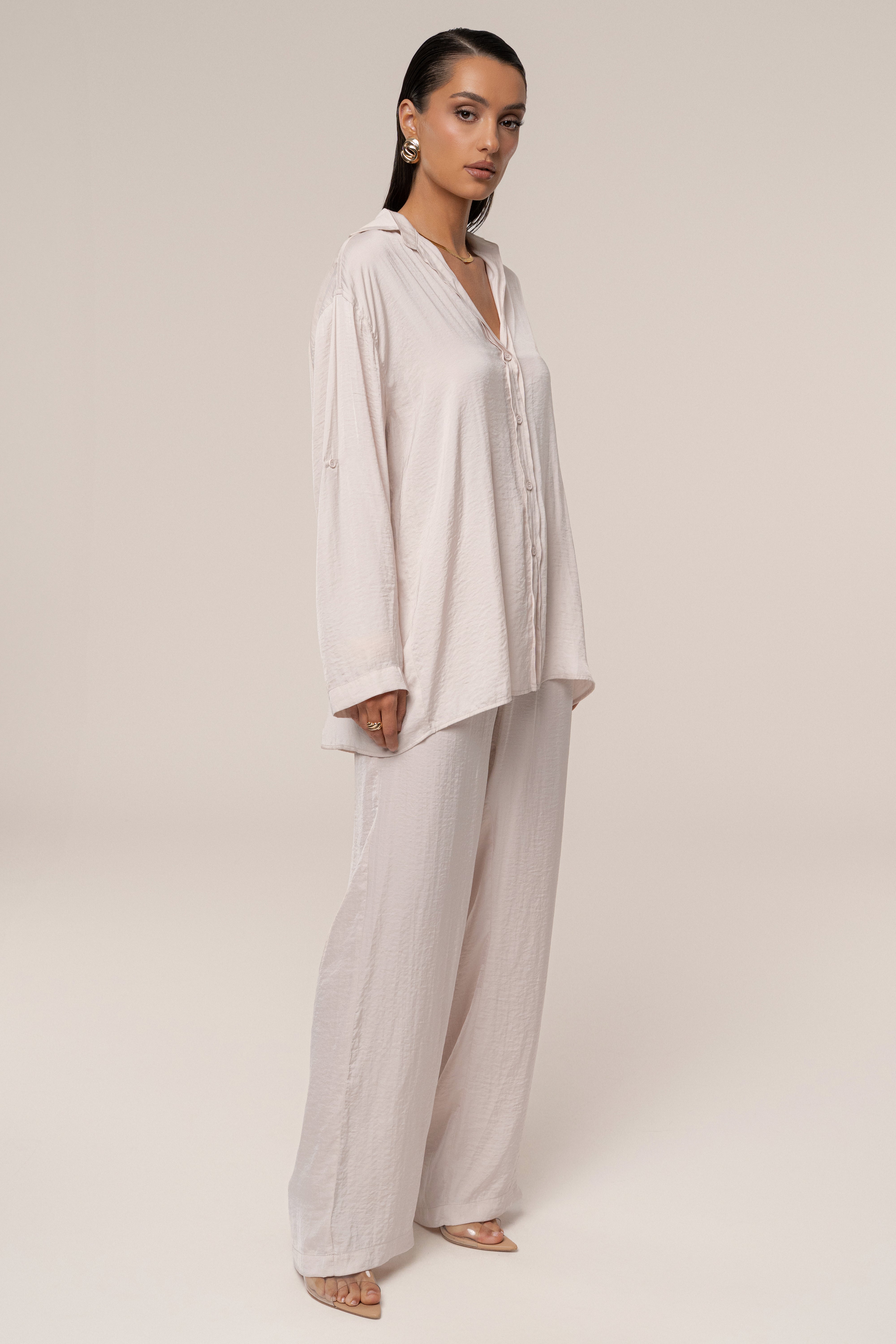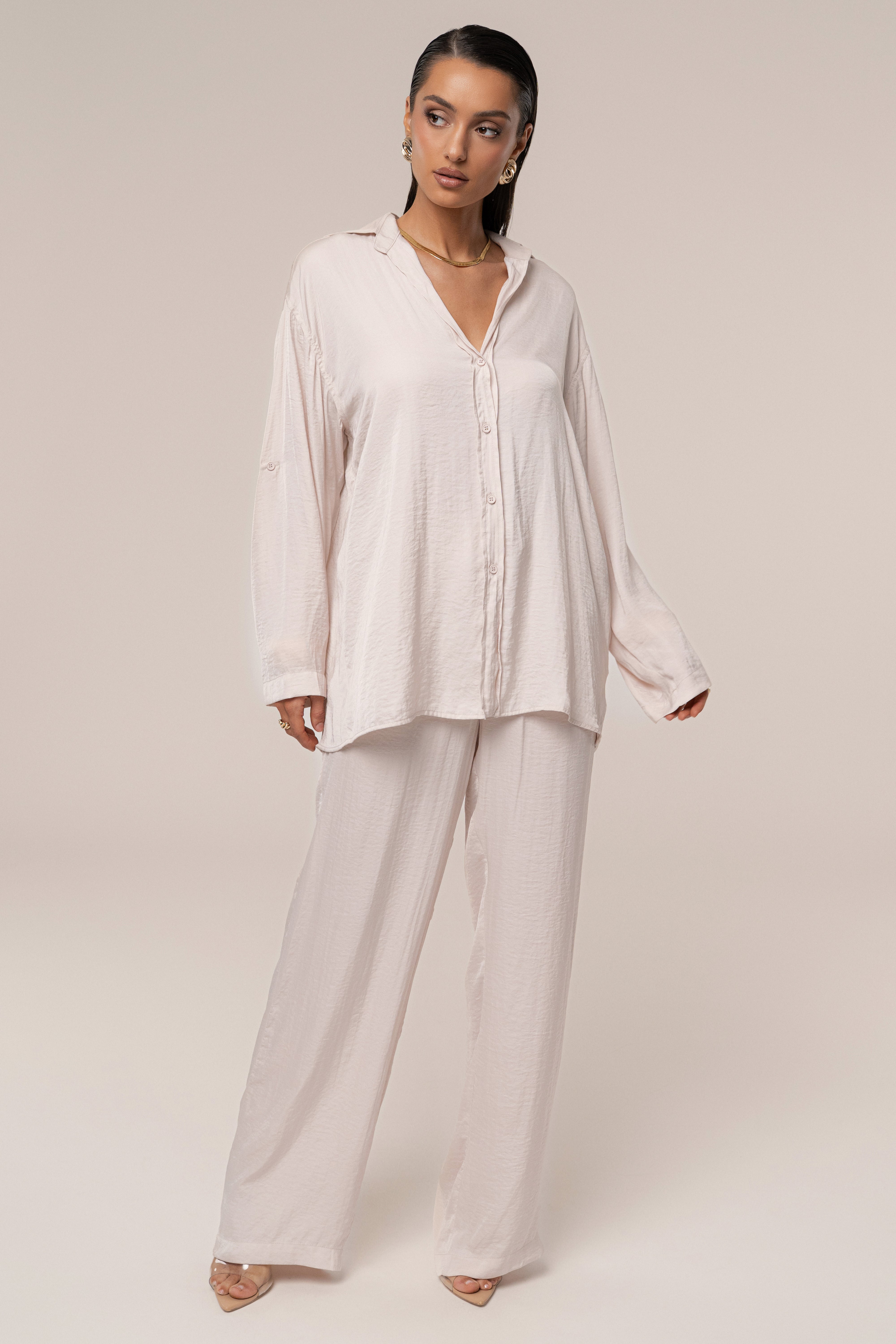 Experience the perfect blend of comfort and coastal elegance. The Milk Pearl Bay Pant Set features a relaxed button-down shirt with long sleeves, paired with matching pants designed with an elastic drawstring waist, functional pockets, and a straight-leg silhouette. This effortlessly polished look is ideal for both casual days and semi-formal occasions. Crafted from lightweight, single-lined material, it’s perfect for warm-weather wear. Stretchy. Sold as a set.