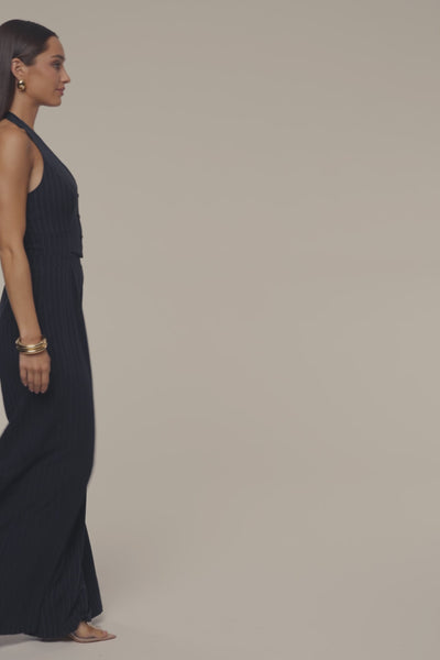Schedule meetings and close deals in our Navy Classic Pinstriped Jumpsuit, a modern take on power dressing. This tailored jumpsuit features a halter neckline with a deep V-cut and classic button detailing, flowing into high-waist, pleated wide-legs for a polished finish. Finished in timeless pinstripes, this pant set creates a polished, elongated silhouette that exudes confidence. Perfect for the office or an elegant evening out, it’s a versatile statement in refined style. Minimal stretch.