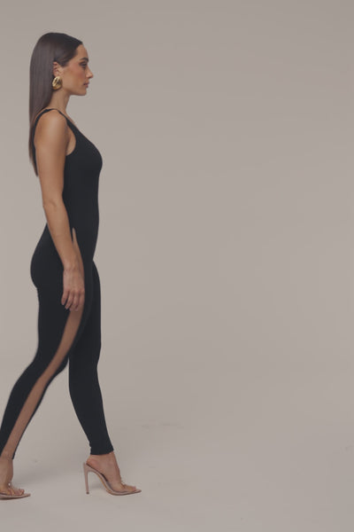 Express your bold side with our new Noir Night Fall Tank Jumpsuit. This stunning jumpsuit design flatters your curves in a form-fitting silhouette featuring a u-neckline, tank shoulders, and ankle length hems. Crafted in smooth double lined fabric with a combination of mesh panels on both sides starting from the hip down to the hem. Double lined. Stretchy.
