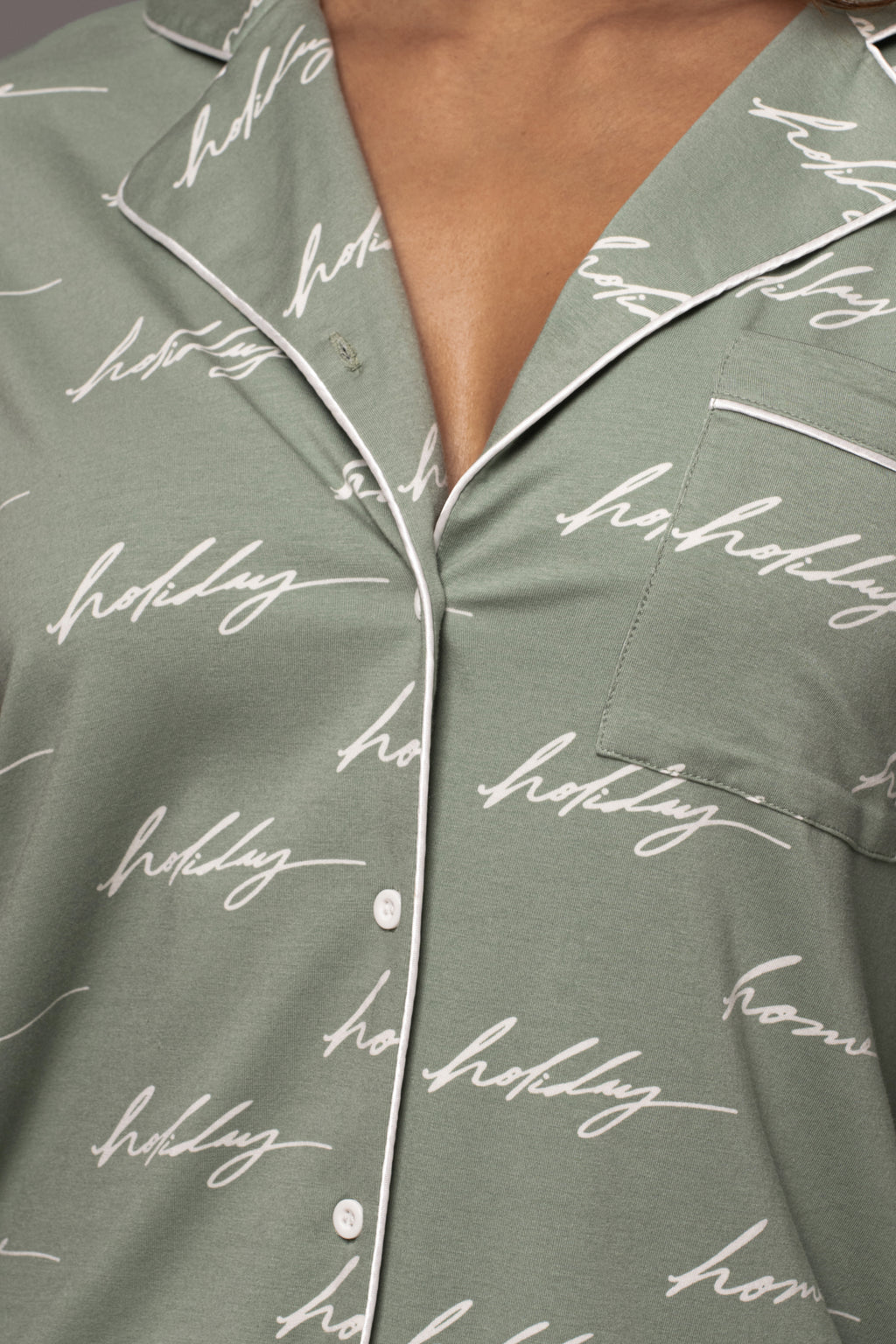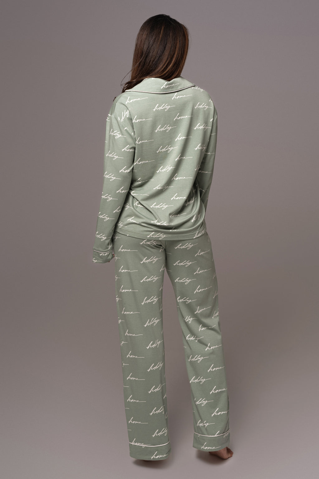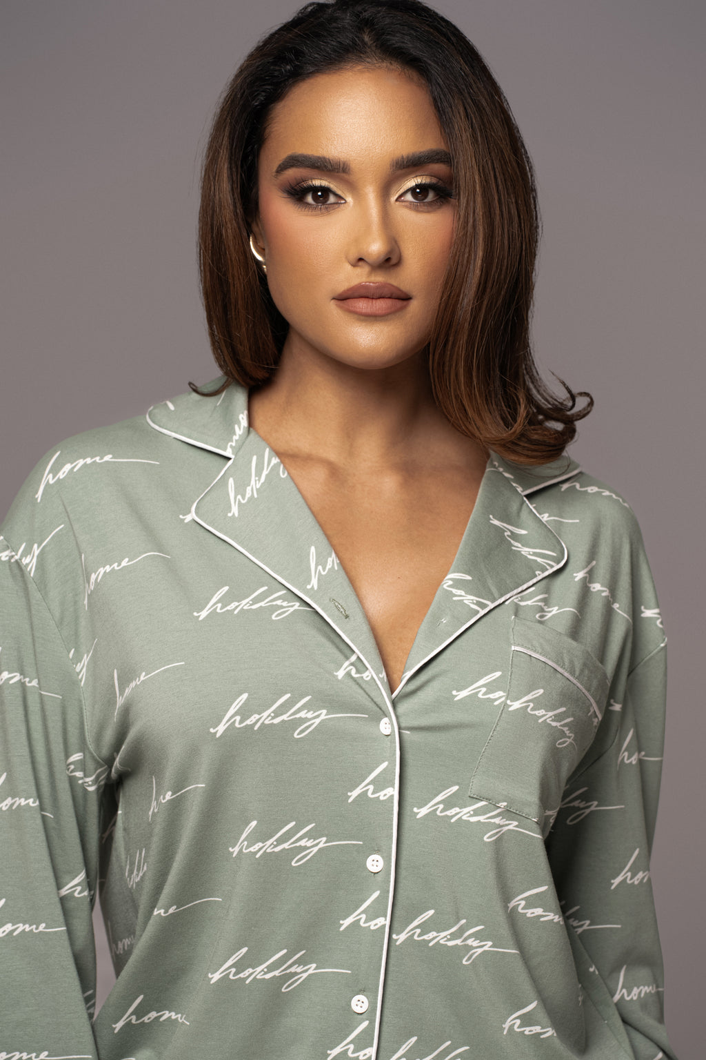 Bring Christmas morning to life with our Sage Home For The Holidays Adult Pajama Set. Designed from soft fabric, these pajamas feature a collared neckline, long sleeves, a chest pocket, and a button-front closure. The matching bottoms are finished with an elastic waistband and side pockets for comfort. A festive cursive print reading ‘Home’ and ‘Holiday’ adds a polished holiday touch. Create picture-perfect memories by matching with the whole family with our Home For The Holiday Kids Pajama Set. Single lined. Some stretch. Sold as set. UNISEX FIT.