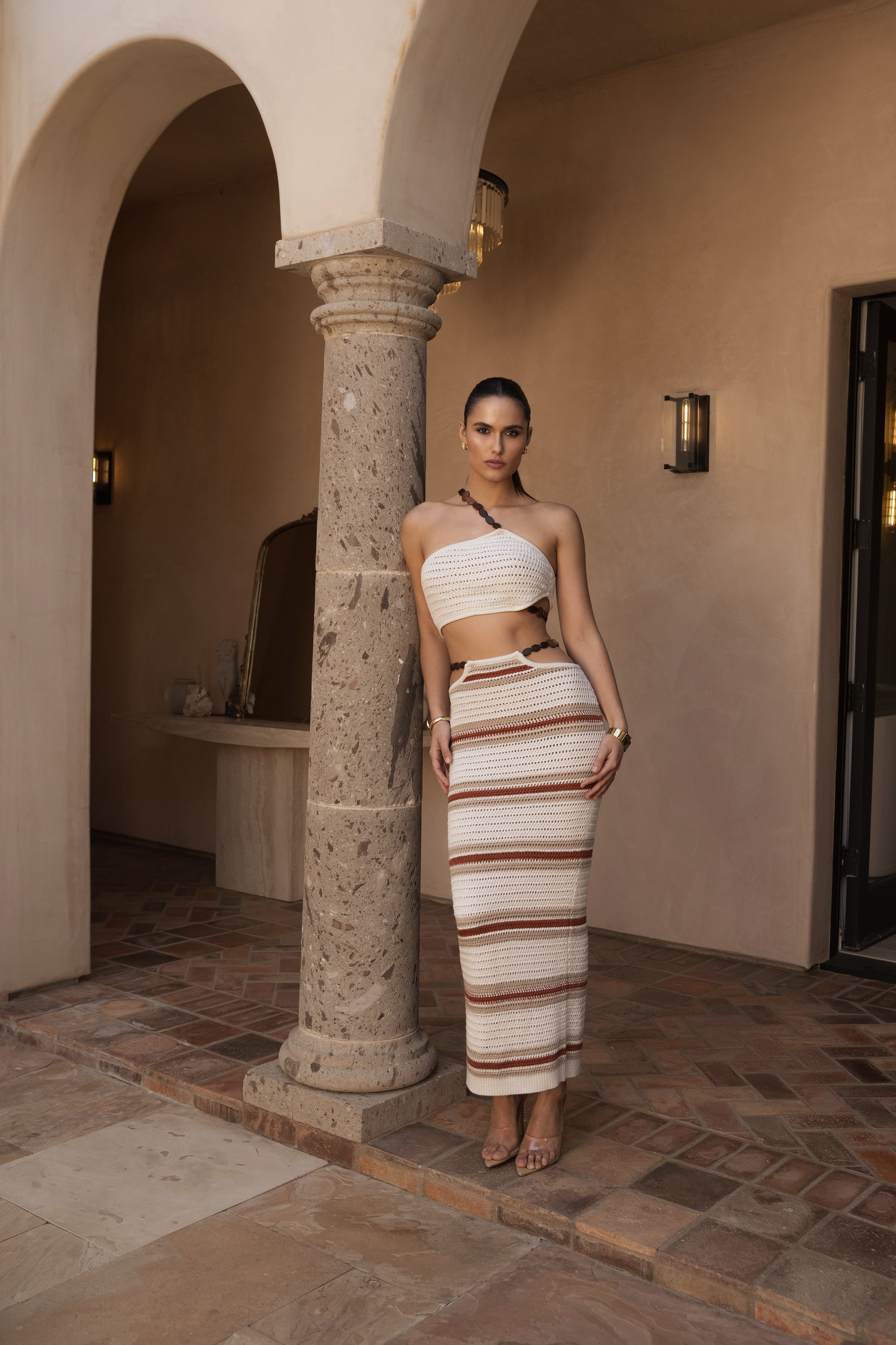 Soft, serene, and beautifully textured in our Sand/Orange Isla Crochet Skirt Set. Featuring a one-shoulder top paired with a long, fitted skirt. This two-piece set showcases alternating white, beige, and red horizontal stripes for a striking contrast. Thoughtfully placed wooden bead details trace the shoulder strap and waistline, adding an earthy, bohemian touch to the design. The cutout detail at the waist enhances the silhouette with a playful yet sophisticated edge. Sold as a set. Minimal Stretch. Nude Lining.