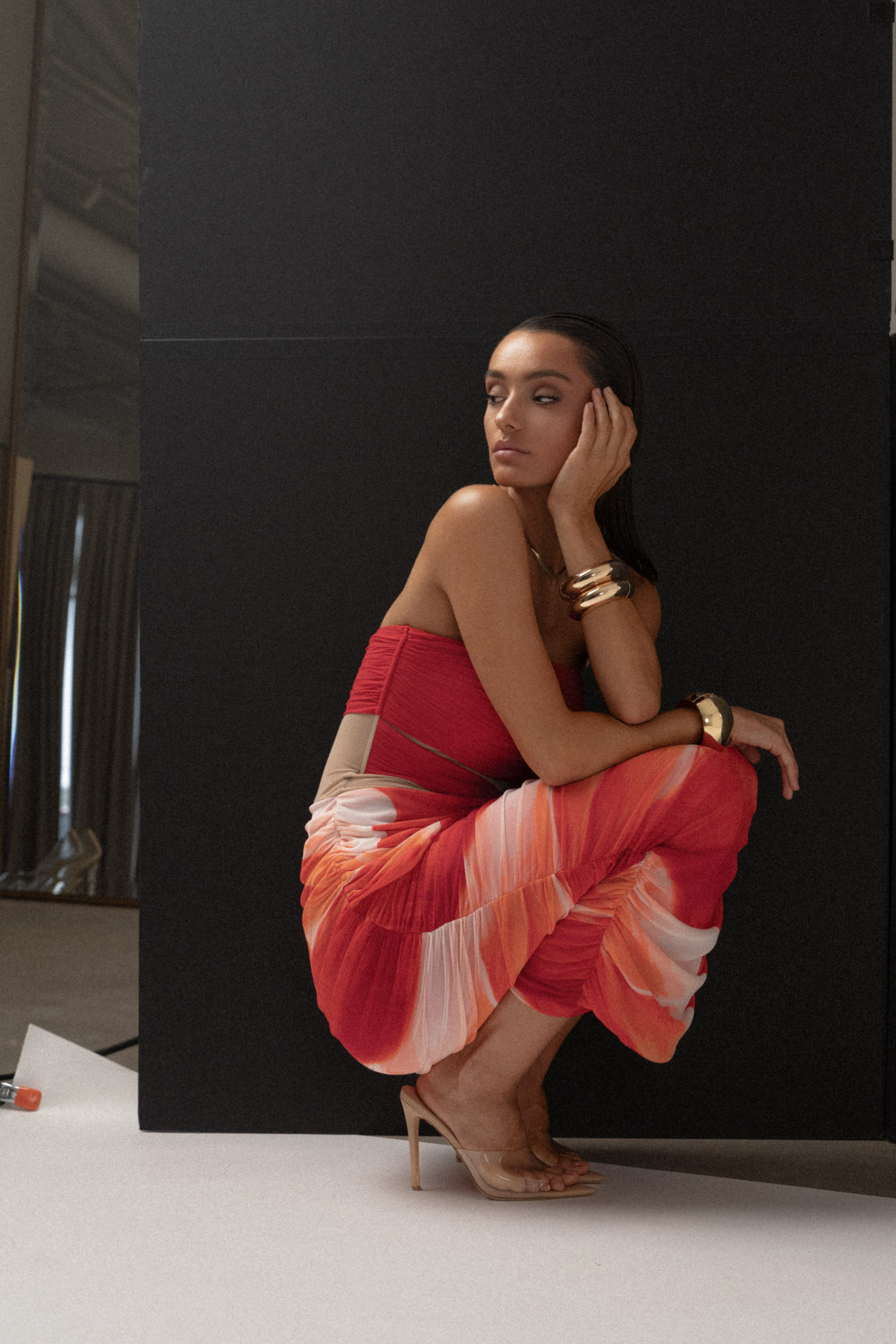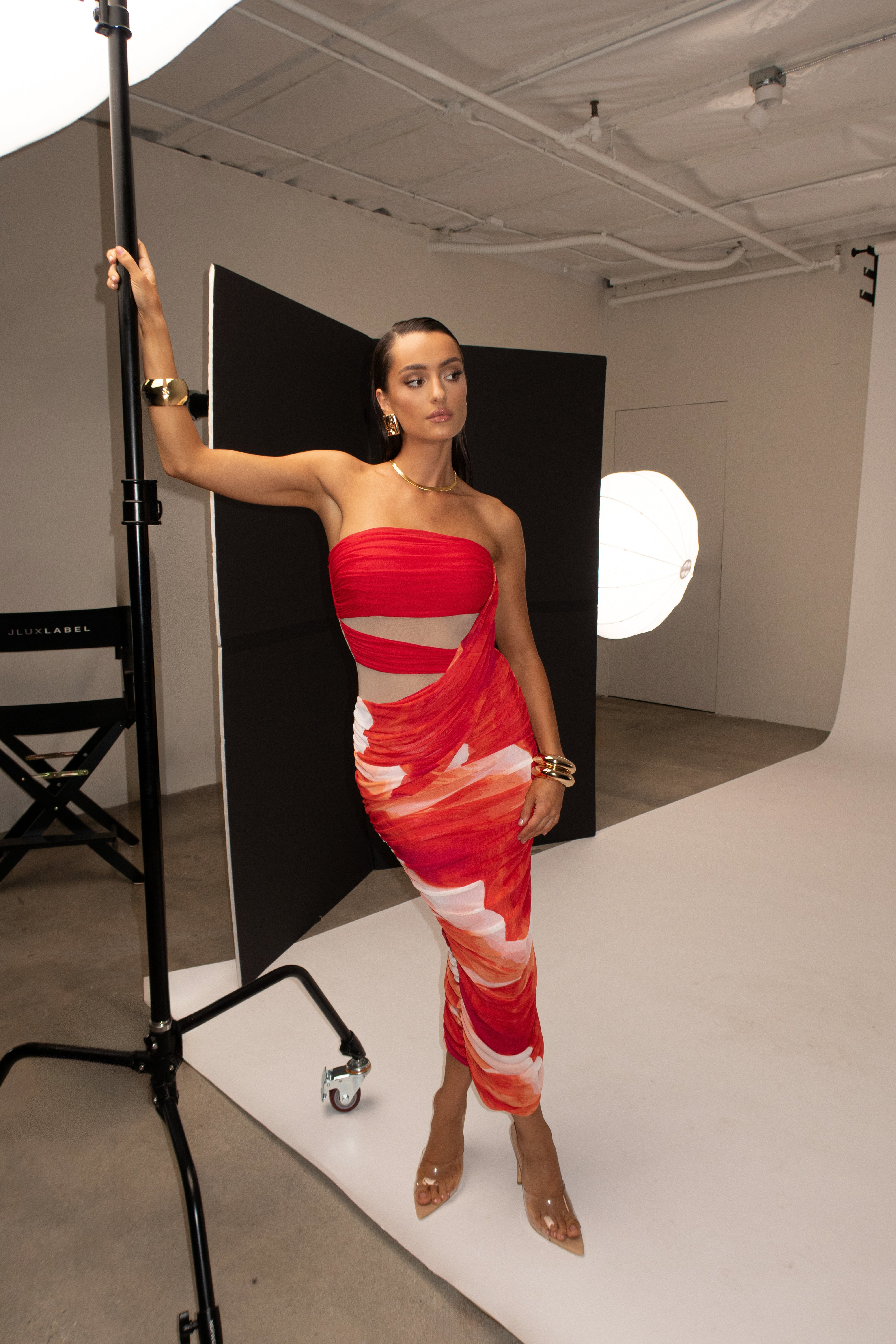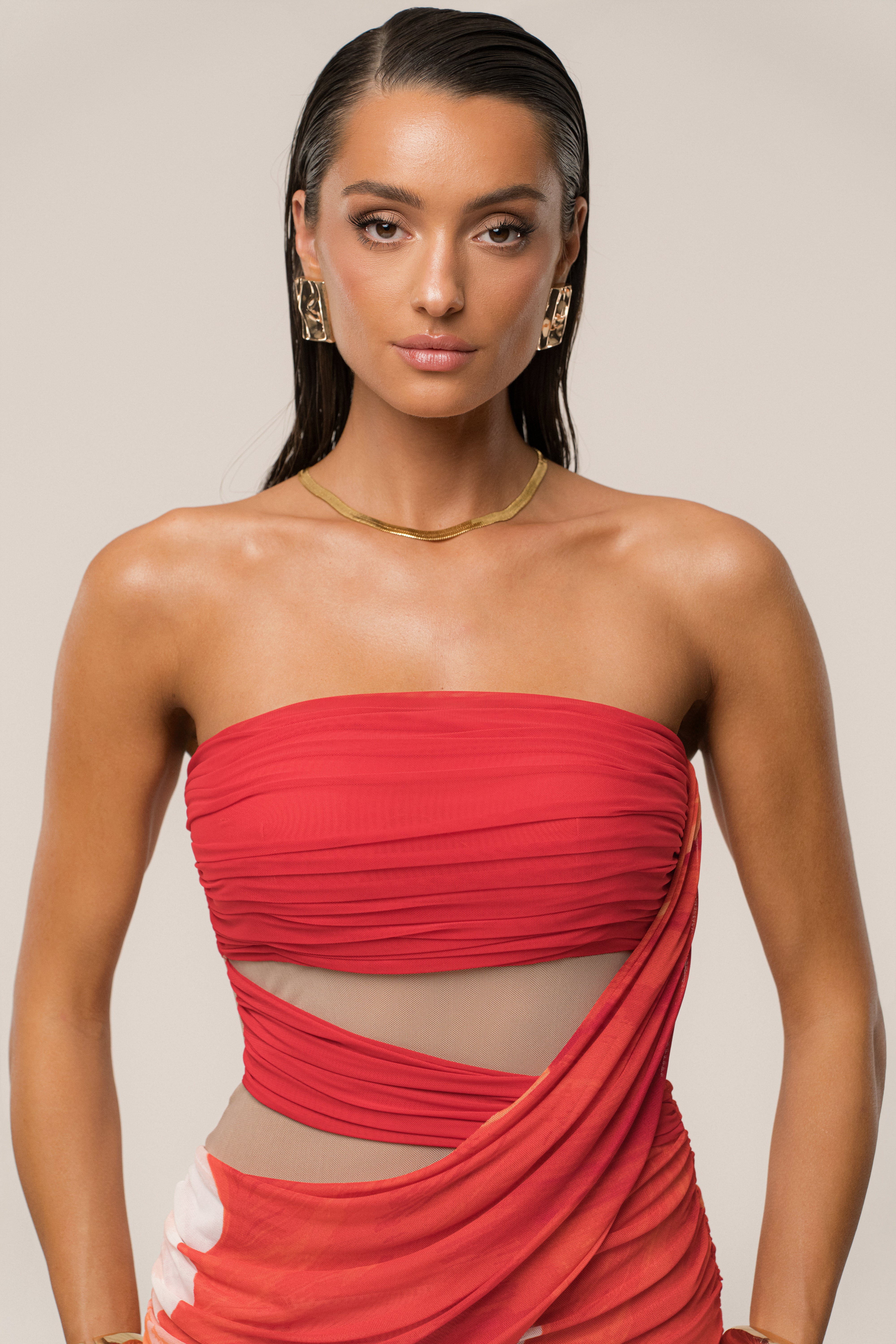 Bring the heat this summer with our Sunset Red Timeless Form Ruched Midi Dress, a bold fusion of modern design and effortless elegance. This captivating strapless silhouette features a bandeau-style top, artful center draping, and allover ruching that enhances every curve. A sheer mesh bodice with boning adds the illusion of a daring cutout, while the vibrant abstract print in red, orange, and white ensures a head-turning finish. Perfect for chic soirées or standout daytime looks. Stretchy. Back zipper closure.
