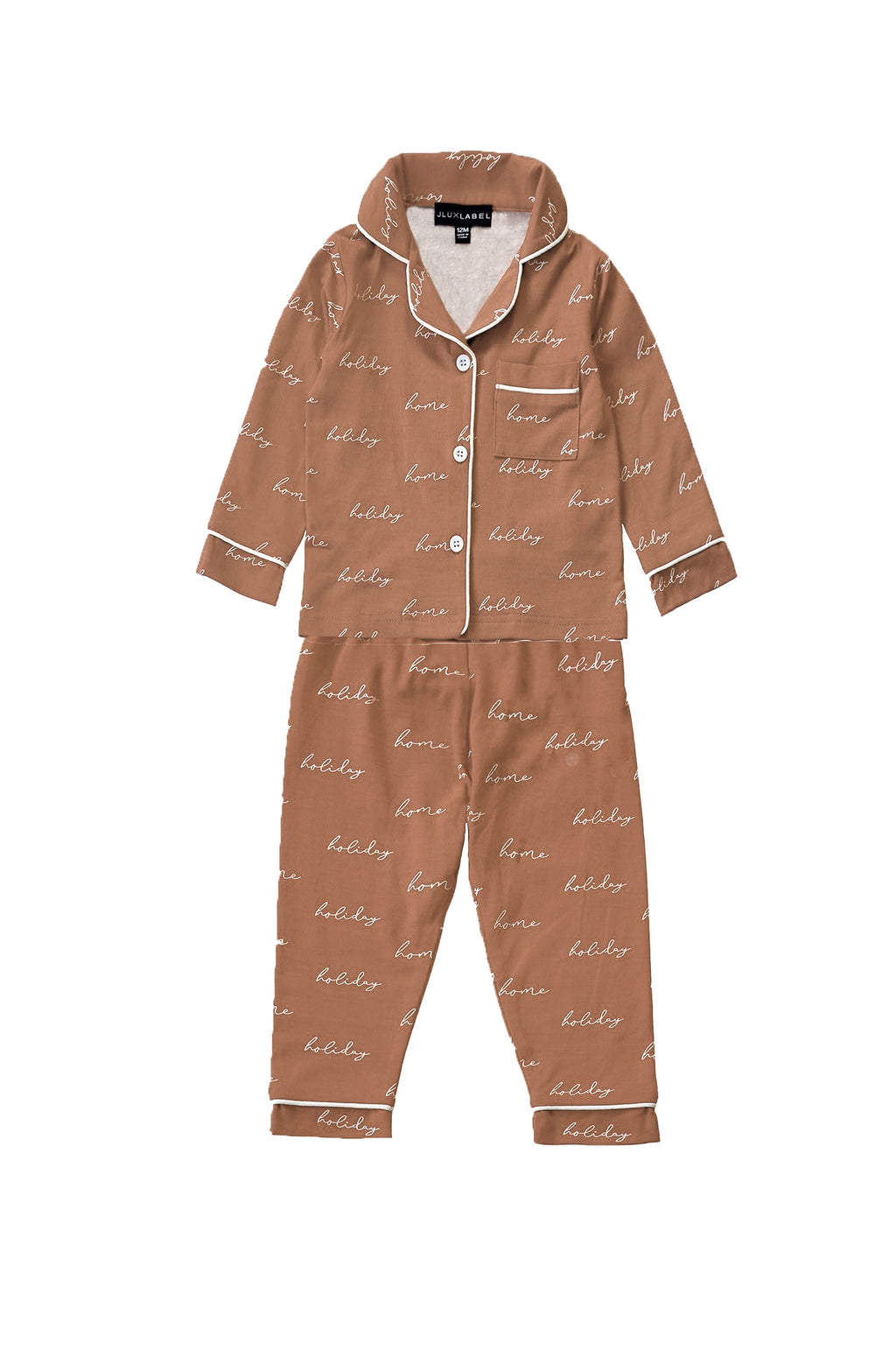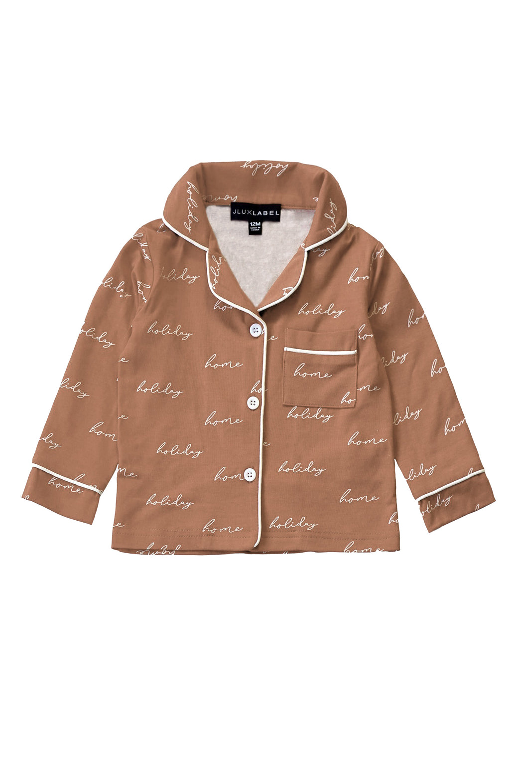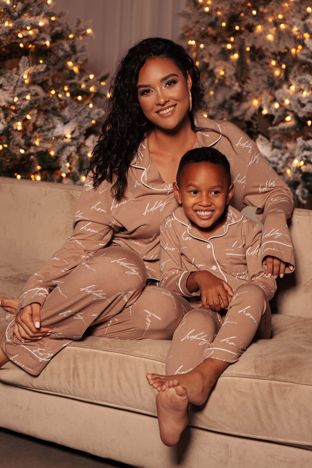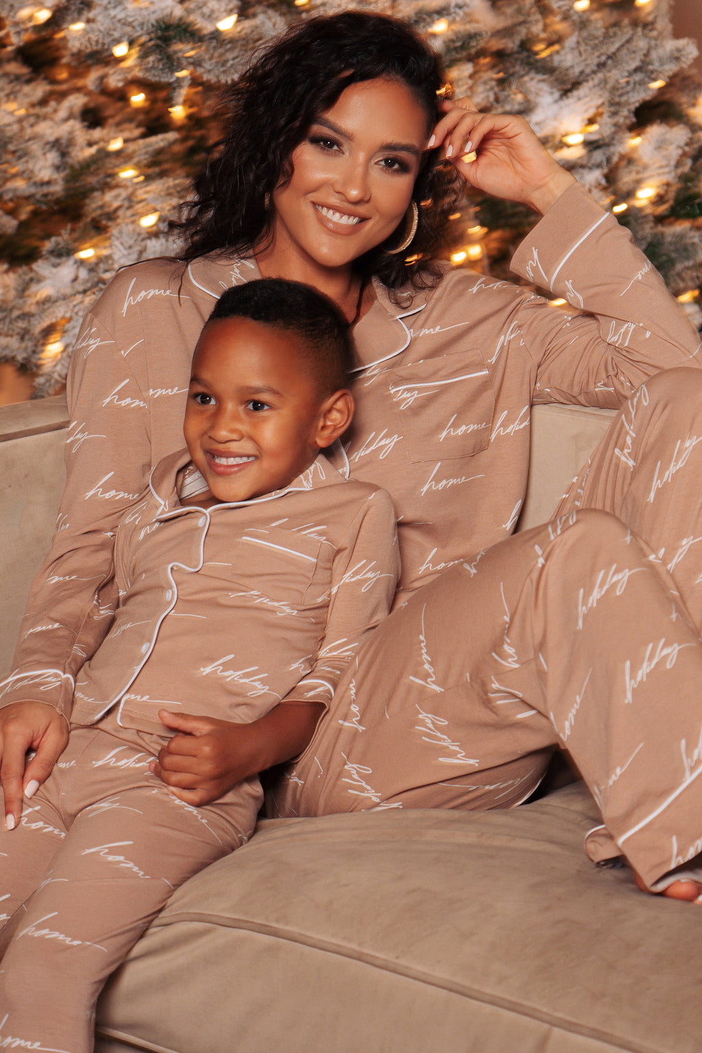 Bring Christmas morning to life with our Beige Home For The Holidays Kids Pajama Set. Designed from soft fabric, these pajamas feature a collared neckline, long sleeves, a chest pocket, and a button-front closure. The matching bottoms are finished with an elastic waistband and side pockets for comfort. A festive cursive print reading ‘Home’ and ‘Holiday’ adds a polished holiday touch. Create picture-perfect memories by matching with the whole family with our Home For The Holidays Adult Pajama Set. Single lined. Some stretch. Sold as set. UNISEX FIT.