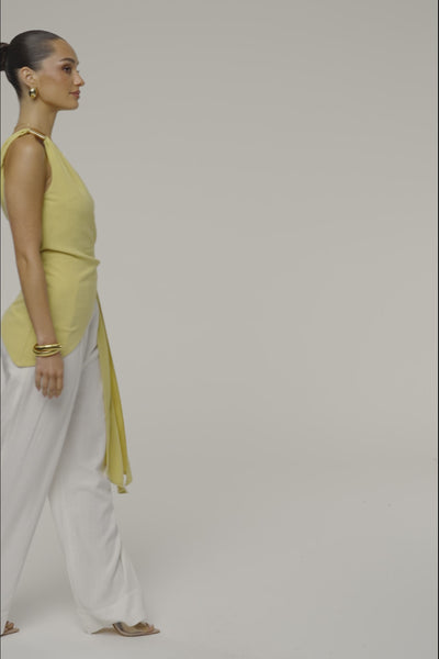 Bring airy sophistication to your wardrobe with our Yellow Palmera One Shoulder Top. Featuring an asymmetrical neckline, side cutout, and a knotted detail at the waist creating a flattering draped effect. A gold-tone accent at the shoulder adds a hint of elegance, while a hidden side zipper ensures a seamless fit. Single-lined. No Stretch.