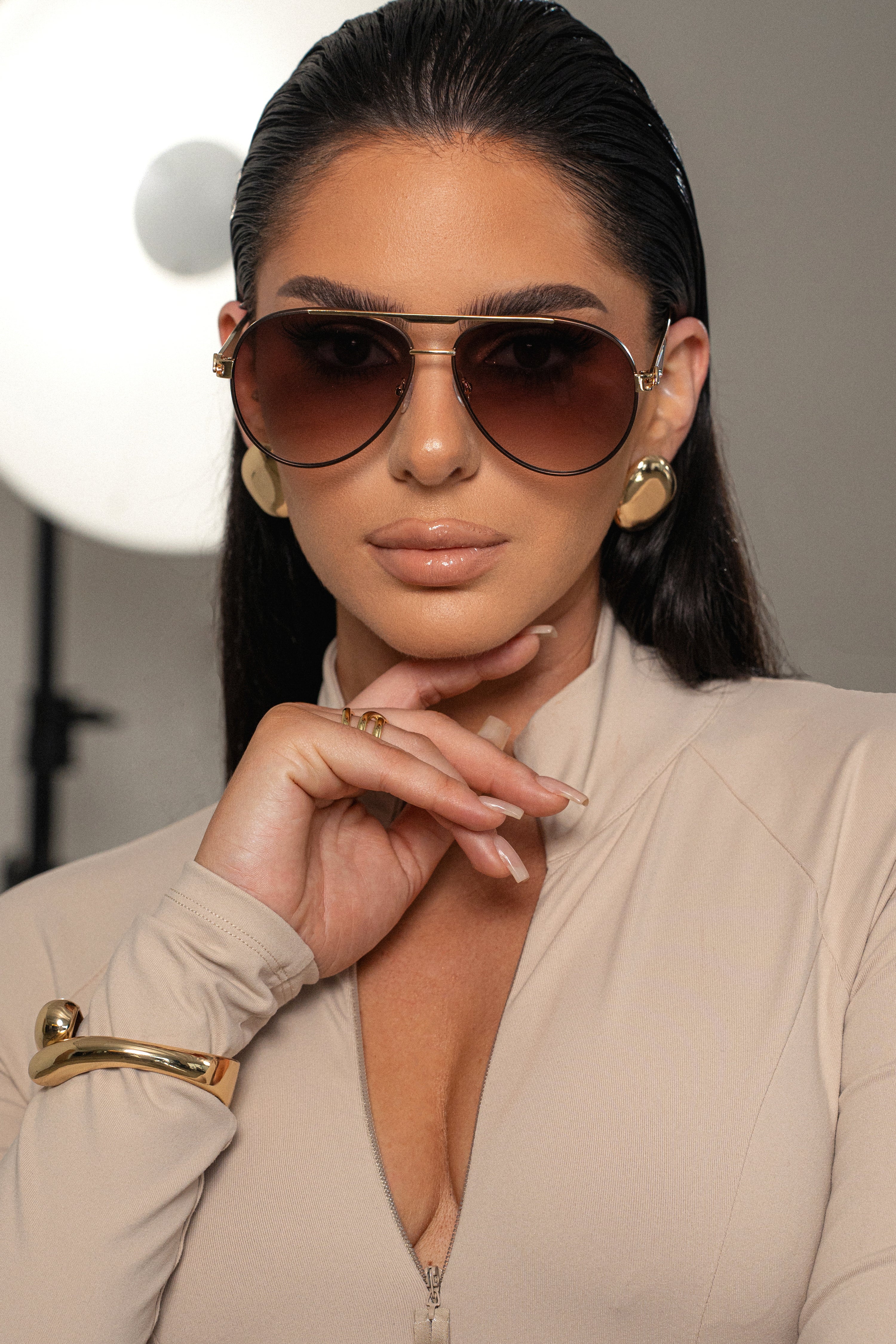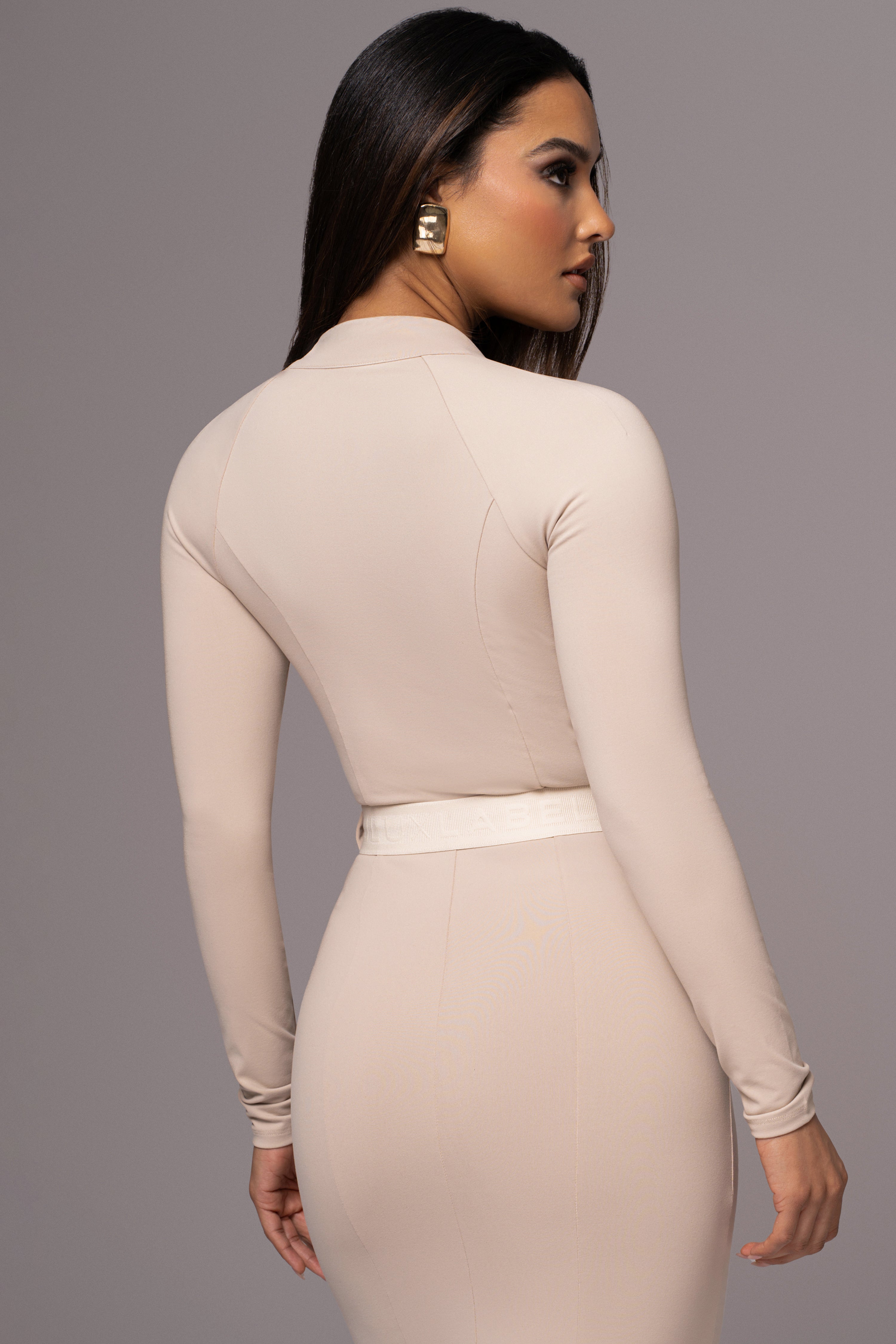 Elevate your confidence with our Beige Movement Mock Maxi Dress. This smooth maxi dress features a zip up design with mock neckline, fitted sleeves, and back slit hem. Complete with an elastic belt and matte buckle, embossed with our Jluxlabel logo. This modern dress is sure to set you apart from the rest. Single lined. Stretchy. Belt included.