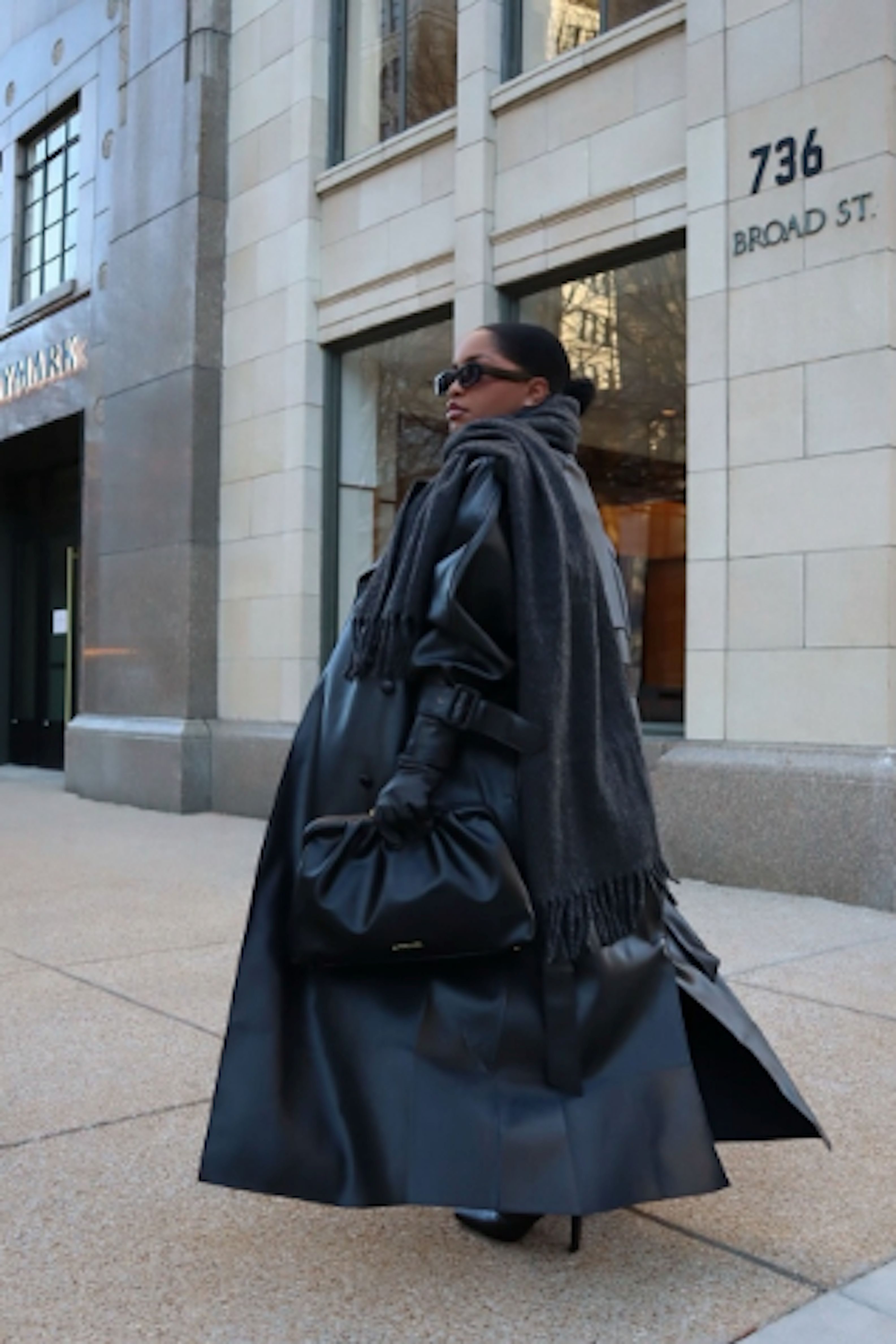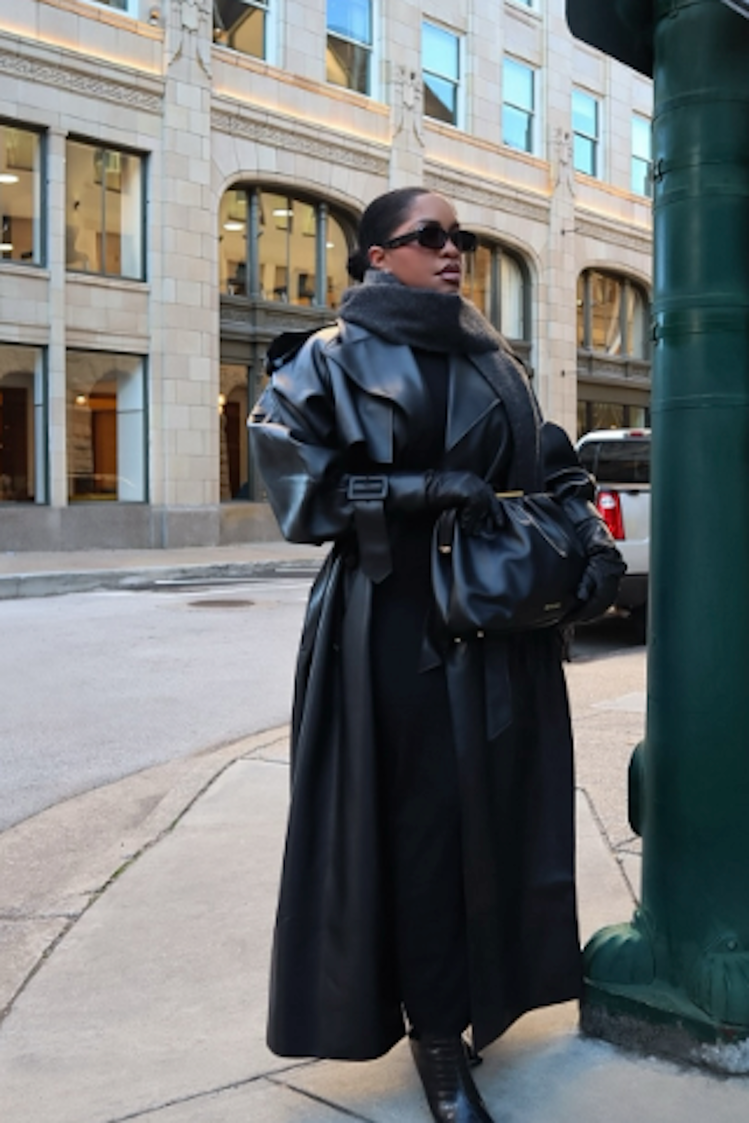 Make a statement in our Black Icon PU Leather Coat, the epitome of modern luxury and timeless edge. Designed in a faux leather finish, this longline trench features long sleeves with an oversized silhouette and bold structure. Details include a wide lapel collar, storm flaps, and belted cuffs for a touch of sophistication. A matching waist tie cinches the shape, adding definition to its relaxed drape. Fully lined for comfort and versatility, this piece redefines everyday outerwear. No stretch.