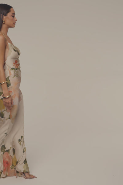 Flourish into elegance with our Ivory Summer Bloom Maxi Dress. Featuring a luxurious satin-like fabric adorned with a vibrant floral print. The soft cowl neckline and delicate spaghetti straps add a touch of sophistication, while the flowing silhouette flatters the figure beautifully. Single lined. No stretch.