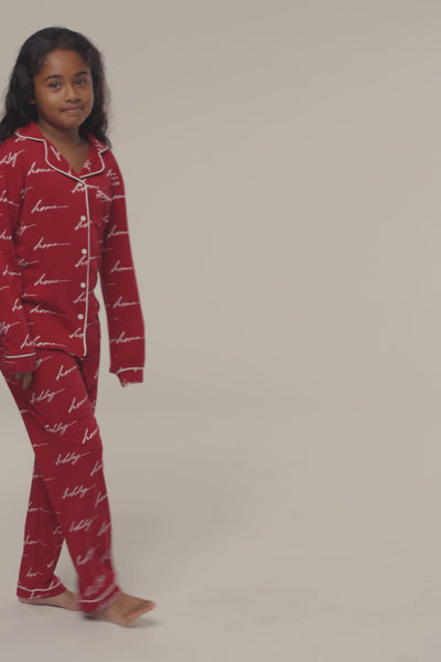 Bring Christmas morning to life with our Merry Red Home For The Holidays Kids Pajama Set. Designed from soft fabric, these pajamas feature a collared neckline, long sleeves, a chest pocket, and a button-front closure. The matching bottoms are finished with an elastic waistband and side pockets for comfort. A festive cursive print reading ‘Home’ and ‘Holiday’ adds a polished holiday touch. Create picture-perfect memories by matching with the whole family with our Home For The Holidays Adult Pajama Set. Single lined. Some stretch. Sold as set. UNISEX FIT.